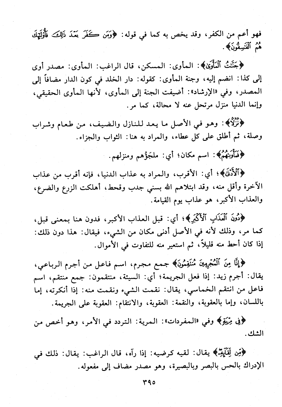 {الْأَدْنَى}؛ أي: الأقرب، والمراد به عذاب الدنيا، فإنه أقرب من عذاب الآخرة وأقل منه، وقد ابتلاهم الله بسني جدب وقحط، أهلكت الزرع والضرع، والعذاب الأكبر، هو عذاب يوم القيامة.