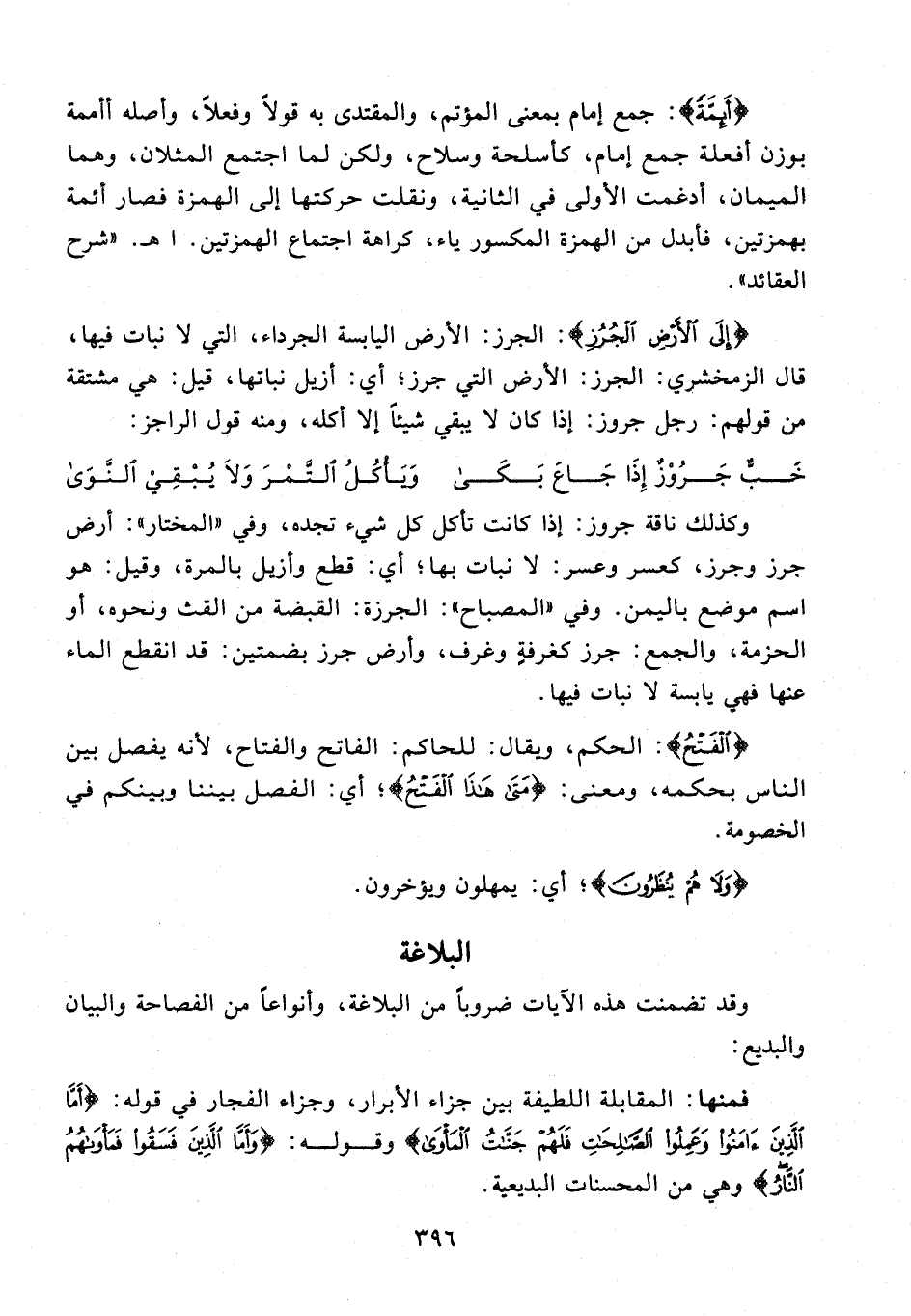 {إِلَى الْأَرْضِ الْجُرُزِ}: الجرز: الأرض اليابسة الجرداء، التي لا نبات فيها، قال الزمخشري: الجرز: الأرض التي جرز؛ أي: أزيل نباتها، قيل: هي مشتقة من قولهم: رجل جروز: إذا كان لا يبقي شيئًا إلا أكله، ومنه قول الراجز: