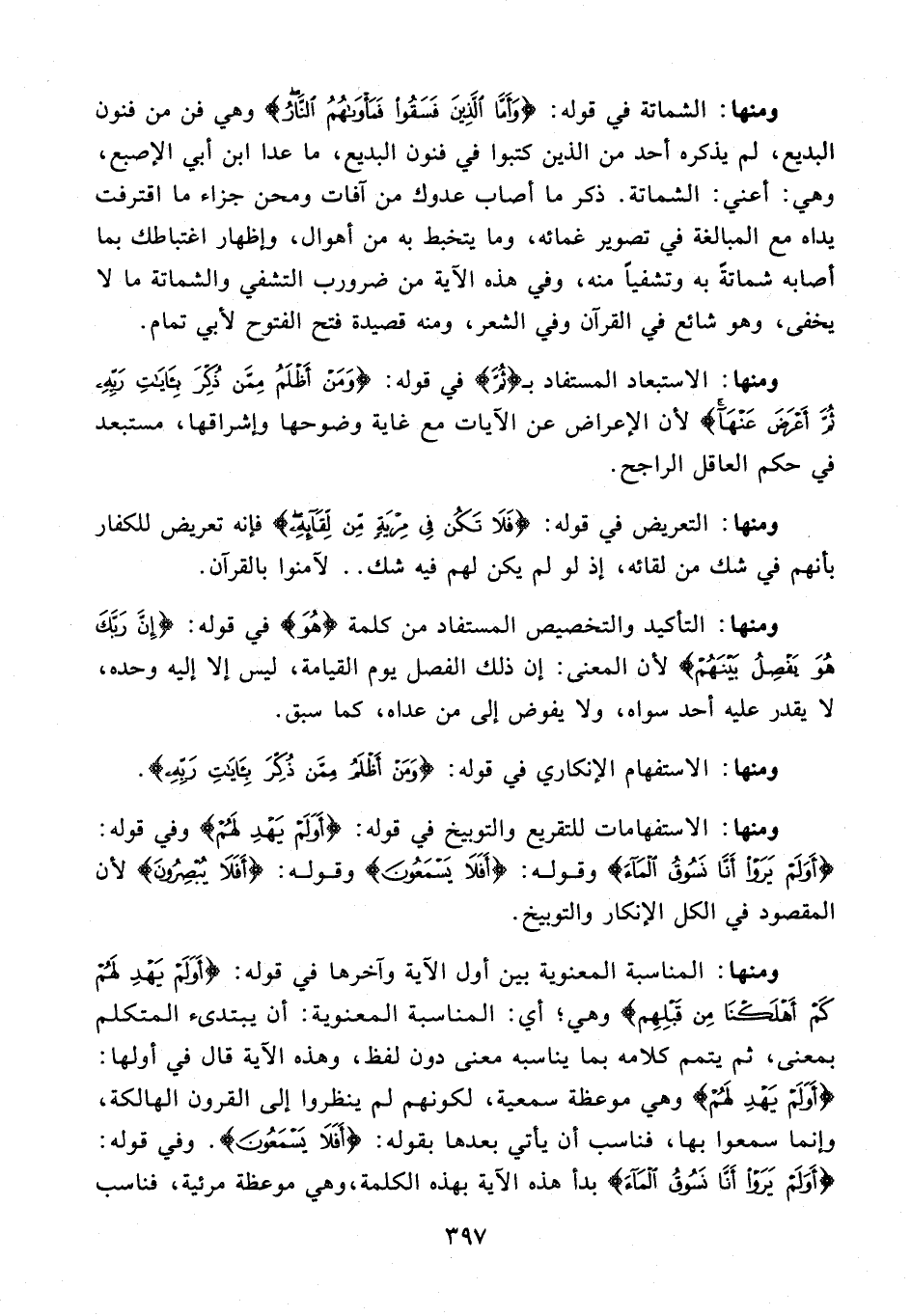 ومنها: الشماتة في قوله: {وَأَمَّا الَّذِينَ فَسَقُوا فَمَأْوَاهُمُ النَّارُ} وهي فن من فنون البديع، لم يذكره أحد من الذين كتبوا في فنون البديع، ما عدا ابن أبي الإصبع، وهي: أعني: الشماتة. ذكر ما أصاب عدوك من آفات ومحن جزاء ما اقترفت يداه مع المبالغة في تصوير غمائه، وما يتخبط به من أهوال، وإظهار إغتباطك بما أصابه شماتةً به وتشفيًا منه، وفي هذه الآية من ضرورب التشفي والشماتة ما لا يخفى، وهو شائع في القرآن وفي الشعر، ومنه قصيدة فتح الفتوح لأبي تمام.
