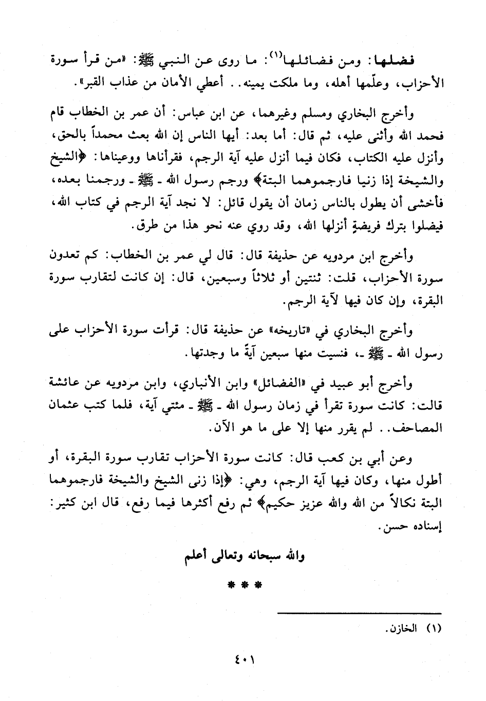 وأخرج ابن مردويه عن حذيفة قال: قال لي عمر بن الخطاب: كم تعدون سورة الأحزاب، قلت: ثنتين أو ثلاثًا وسبعين، قال: إن كانت لتقارب سورة البقرة، وإن كان فيها لآية الرجم.