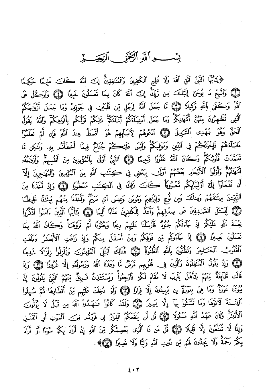 {يَا أَيُّهَا النَّبِيُّ اتَّقِ اللَّهَ وَلَا تُطِعِ الْكَافِرِينَ وَالْمُنَافِقِينَ إِنَّ اللَّهَ كَانَ عَلِيمًا حَكِيمًا (1) وَاتَّبِعْ مَا يُوحَى إِلَيْكَ مِنْ رَبِّكَ إِنَّ اللَّهَ كَانَ بِمَا تَعْمَلُونَ خَبِيرًا (2) وَتَوَكَّلْ عَلَى اللَّهِ وَكَفَى بِاللَّهِ وَكِيلًا (3) مَا جَعَلَ اللَّهُ لِرَجُلٍ مِنْ قَلْبَيْنِ فِي جَوْفِهِ وَمَا جَعَلَ أَزْوَاجَكُمُ اللَّائِي تُظَاهِرُونَ مِنْهُنَّ أُمَّهَاتِكُمْ وَمَا جَعَلَ أَدْعِيَاءَكُمْ أَبْنَاءَكُمْ ذَلِكُمْ قَوْلُكُمْ بِأَفْوَاهِكُمْ وَاللَّهُ يَقُولُ الْحَقَّ وَهُوَ يَهْدِي السَّبِيلَ (4) ادْعُوهُمْ لِآبَائِهِمْ هُوَ أَقْسَطُ عِنْدَ اللَّهِ فَإِنْ لَمْ تَعْلَمُوا آبَاءَهُمْ فَإِخْوَانُكُمْ فِي الدِّينِ وَمَوَالِيكُمْ وَلَيْسَ عَلَيْكُمْ جُنَاحٌ فِيمَا أَخْطَأْتُمْ بِهِ وَلَكِنْ مَا تَعَمَّدَتْ قُلُوبُكُمْ وَكَانَ اللَّهُ غَفُورًا رَحِيمًا (5) النَّبِيُّ أَوْلَى بِالْمُؤْمِنِينَ مِنْ أَنْفُسِهِمْ وَأَزْوَاجُهُ أُمَّهَاتُهُمْ وَأُولُو الْأَرْحَامِ بَعْضُهُمْ أَوْلَى بِبَعْضٍ فِي كِتَابِ اللَّهِ مِنَ الْمُؤْمِنِينَ وَالْمُهَاجِرِينَ إِلَّا أَنْ تَفْعَلُوا إِلَى أَوْلِيَائِكُمْ مَعْرُوفًا كَانَ ذَلِكَ فِي الْكِتَابِ مَسْطُورًا (6) وَإِذْ أَخَذْنَا مِنَ النَّبِيِّينَ مِيثَاقَهُمْ وَمِنْكَ وَمِنْ نُوحٍ وَإِبْرَاهِيمَ وَمُوسَى وَعِيسَى ابْنِ مَرْيَمَ وَأَخَذْنَا مِنْهُمْ مِيثَاقًا غَلِيظًا (7) لِيَسْأَلَ الصَّادِقِينَ عَنْ صِدْقِهِمْ وَأَعَدَّ لِلْكَافِرِينَ عَذَابًا أَلِيمًا (8) يَا أَيُّهَا الَّذِينَ آمَنُوا اذْكُرُوا نِعْمَةَ اللَّهِ عَلَيْكُمْ إِذْ جَاءَتْكُمْ جُنُودٌ فَأَرْسَلْنَا عَلَيْهِمْ رِيحًا وَجُنُودًا لَمْ تَرَوْهَا وَكَانَ اللَّهُ بِمَا تَعْمَلُونَ بَصِيرًا (9) إِذْ جَاءُوكُمْ مِنْ فَوْقِكُمْ وَمِنْ أَسْفَلَ مِنْكُمْ وَإِذْ زَاغَتِ الْأَبْصَارُ وَبَلَغَتِ الْقُلُوبُ الْحَنَاجِرَ وَتَظُنُّونَ بِاللَّهِ الظُّنُونَا (10) هُنَالِكَ ابْتُلِيَ الْمُؤْمِنُونَ وَزُلْزِلُوا زِلْزَالًا شَدِيدًا (11) وَإِذْ يَقُولُ الْمُنَافِقُونَ وَالَّذِينَ فِي قُلُوبِهِمْ مَرَضٌ مَا وَعَدَنَا اللَّهُ وَرَسُولُهُ إِلَّا غُرُورًا (12) وَإِذْ قَالَتْ طَائِفَةٌ مِنْهُمْ يَا أَهْلَ يَثْرِبَ لَا مُقَامَ لَكُمْ فَارْجِعُوا وَيَسْتَأْذِنُ فَرِيقٌ مِنْهُمُ النَّبِيَّ يَقُولُونَ إِنَّ بُيُوتَنَا عَوْرَةٌ وَمَا هِيَ بِعَوْرَةٍ إِنْ يُرِيدُونَ إِلَّا فِرَارًا (13) وَلَوْ دُخِلَتْ عَلَيْهِمْ مِنْ أَقْطَارِهَا ثُمَّ سُئِلُوا الْفِتْنَةَ لَآتَوْهَا وَمَا تَلَبَّثُوا بِهَا إِلَّا يَسِيرًا (14) وَلَقَدْ كَانُوا عَاهَدُوا اللَّهَ مِنْ قَبْلُ لَا يُوَلُّونَ الْأَدْبَارَ وَكَانَ عَهْدُ اللَّهِ مَسْئُولًا (15) قُلْ لَنْ يَنْفَعَكُمُ الْفِرَارُ إِنْ فَرَرْتُمْ مِنَ الْمَوْتِ أَوِ الْقَتْلِ وَإِذًا لَا تُمَتَّعُونَ إِلَّا قَلِيلًا (16) قُلْ مَنْ ذَا الَّذِي يَعْصِمُكُمْ مِنَ اللَّهِ إِنْ أَرَادَ بِكُمْ سُوءًا أَوْ أَرَادَ بِكُمْ رَحْمَةً وَلَا يَجِدُونَ لَهُمْ مِنْ دُونِ اللَّهِ وَلِيًّا وَلَا نَصِيرًا (17)}.