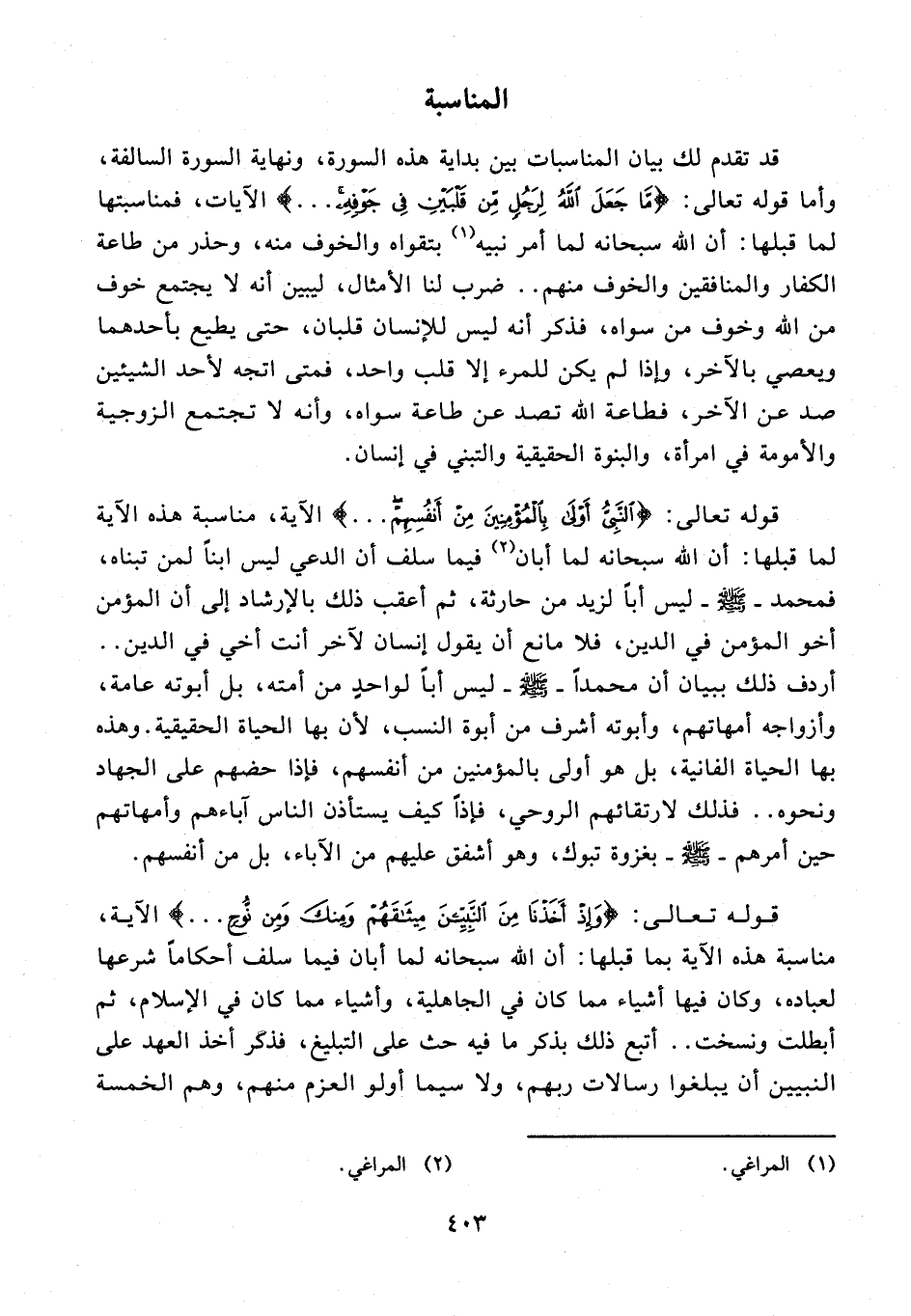 قد تقدم لك بيان المناسبات بين بداية هذه السورة، ونهاية السورة السالفة، وأما قوله تعالى: {مَا جَعَلَ اللَّهُ لِرَجُلٍ مِنْ قَلْبَيْنِ فِي جَوْفِهِ ...} الآيات، فمناسبتها لما قبلها: أن الله سبحانه لما أمر نبيه (¬1) بتقواه والخوف منه، وحذر من طاعة الكفار والمنافقين والخوف منهم .. ضرب لنا الأمثال، ليبين أنه لا يجتمع خوف من الله وخوف من سواه، فذكر أنه ليس للإنسان قلبان، حتى يطيع بأحدهما ويعصي بالآخر، وإذا لم يكن للمرء إلا قلب واحد، فمتى اتجه لأحد الشيئين صد عن الآخر، فطاعة الله تصد عن طاعة سواه، وأنه لا تجتمع الزوجية والأمومة في امرأة، والبنوة الحقيقية والتبني في إنسان.