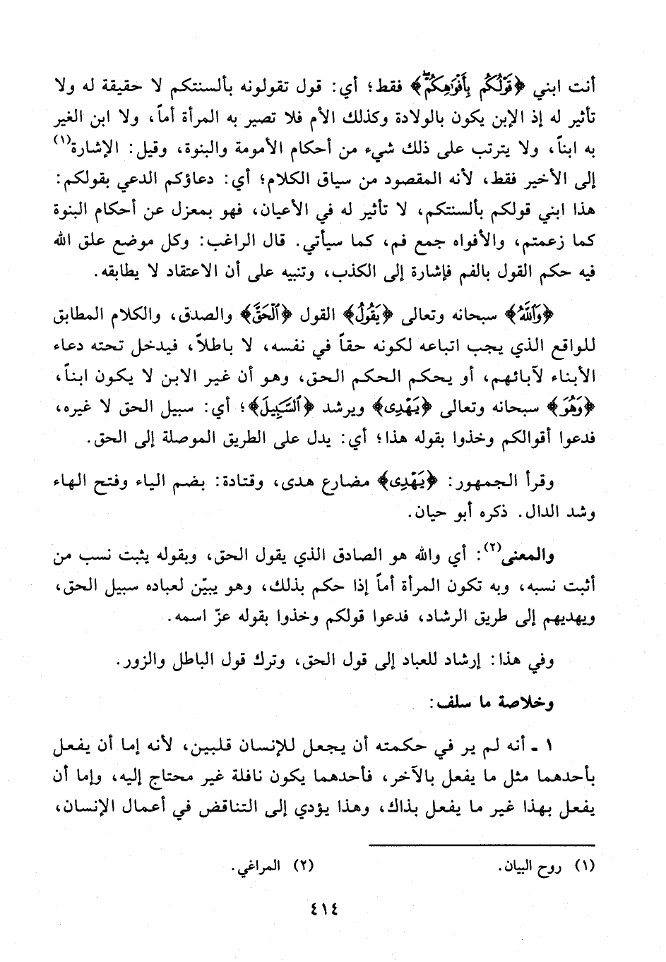 والمعنى (¬2): أي والله هو الصادق الذي يقول الحق، وبقوله يثبت نسب من أثبت نسبه، وبه تكون المرأة أمًا إذا حكم بذلك، وهو يبيّن لعباده سبيل الحق، ويهديهم إلى طريق الرشاد، فدعوا قولكم وخذوا بقوله عزّ اسمه.