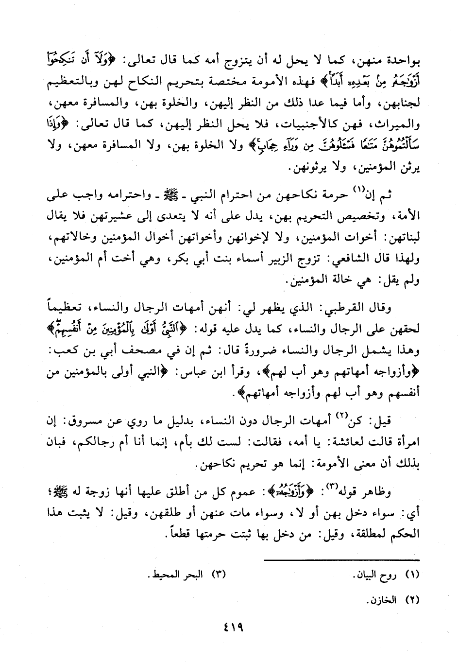 ثم إن (¬1) حرمة نكاحهن من احترام النبي - صلى الله عليه وسلم - واحترامه واجب على الأمة، وتخصيص التحريم بهن، يدل على أنه لا يتعدى إلى عشيرتهن فلا يقال لبناتهن: أخوات المؤمنين، ولا لإخوانهن وأخواتهن أخوال المؤمنين وخالاتهم، ولهذا قال الشافعي: تزوج الزبير أسماء بنت أبي بكر، وهي أخت أم المؤمنين، ولم يقل: هي خالة المؤمنين.