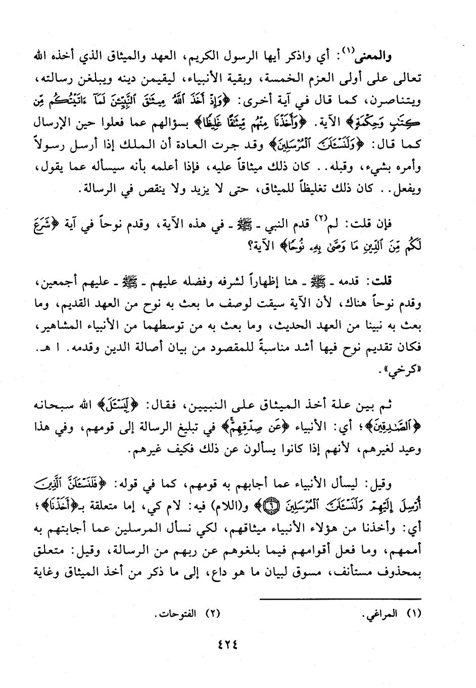 والمعنى (¬1): أي واذكر أيها الرسول الكريم، العهد والميثاق الذي أخذه الله تعالى على أولى العزم الخمسة، وبقية الأنبياء، ليقيمن دينه ويبلغن رسالته، ويتناصرن، كما قال في آية أخرى: {وَإِذْ أَخَذَ اللَّهُ مِيثَاقَ النَّبِيِّينَ لَمَا آتَيْتُكُمْ مِنْ كِتَابٍ وَحِكْمَةٍ} الآية. {وَأَخَذْنَا مِنْهُمْ مِيثَاقًا غَلِيظًا} بسؤالهم عما فعلوا حين الإرسال كما قال: {وَلَنَسْأَلَنَّ الْمُرْسَلِينَ} وقد جرت العادة أن الملك إذا أرسل رسولًا وأمره بشيء، وقبله .. كان ذلك ميثاقًا عليه، فإذا أعلمه بأنه سيسأله عما يقول، ويفعل .. كان ذلك تغليظًا للميثاق، حتى لا يزيد ولا ينقص في الرسالة.