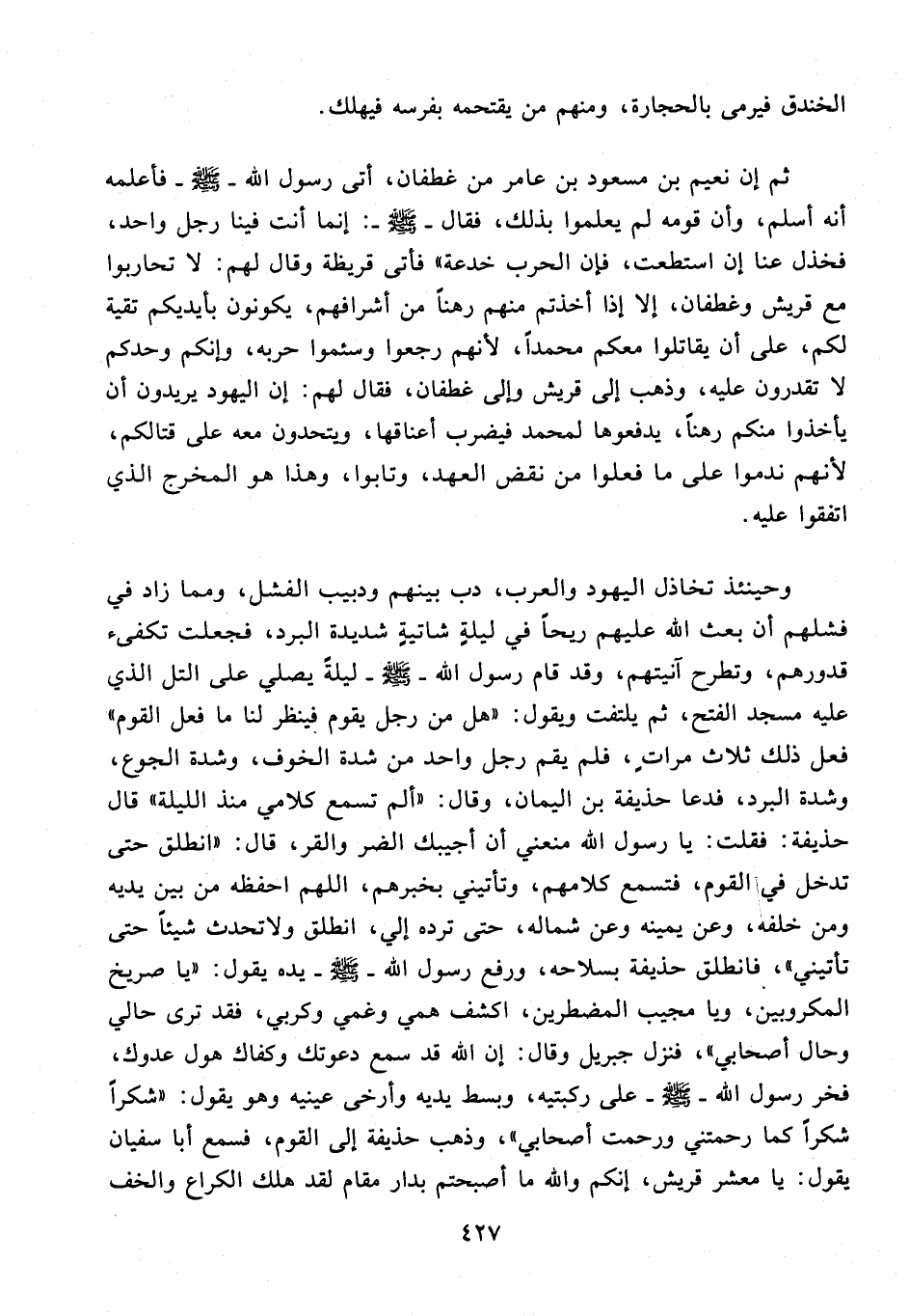 ثم إن نعيم بن مسعود بن عامر من غطفان، أتى رسول الله - صلى الله عليه وسلم - فأعلمه أنه أسلم، وأن قومه لم يعلموا بذلك، فقال - صلى الله عليه وسلم -: إنما أنت فينا رجل واحد، فخذل عنا إن استطعت، فإن الحرب خدعة" فأتى قريظة وقال لهم: لا تحاربوا مع قريش وغطفان، إلا إذا أخذتم منهم رهنًا من أشرافهم، يكونون بأيديكم تقية لكم، على أن يقاتلوا معكم محمدًا, لأنهم رجعوا وسئموا حربه، وإنكم وحدكم لا تقدرون عليه، وذهب إلى قريش وإلى غطفان، فقال لهم: إن اليهود يريدون أن يأخذوا منكم رهنًا، يدفعوها لمحمد فيضرب أعناقها، ويتحدون معه على قتالكم، لأنهم ندموا على ما فعلوا من نقض العهد، وتابوا، وهذا هو المخرج الذي اتفقوا عليه.