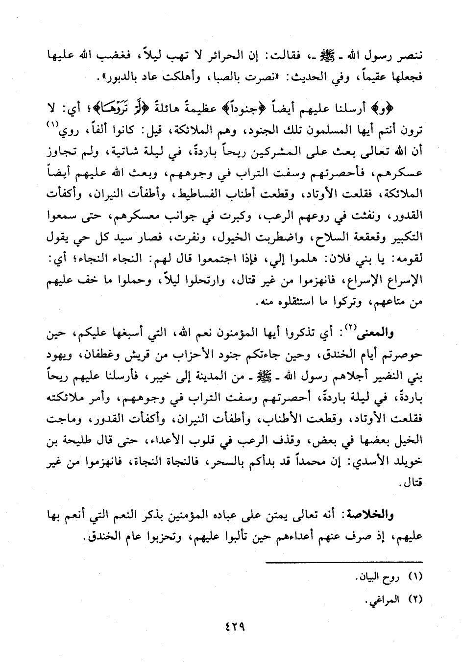 والخلاصة: أنه تعالى يمتن على عباده المؤمنين بذكر النعم التي أنعم بها عليهم، إذ صرف عنهم أعداءهم حين تألبوا عليهم، وتحزبوا عام الخندق.