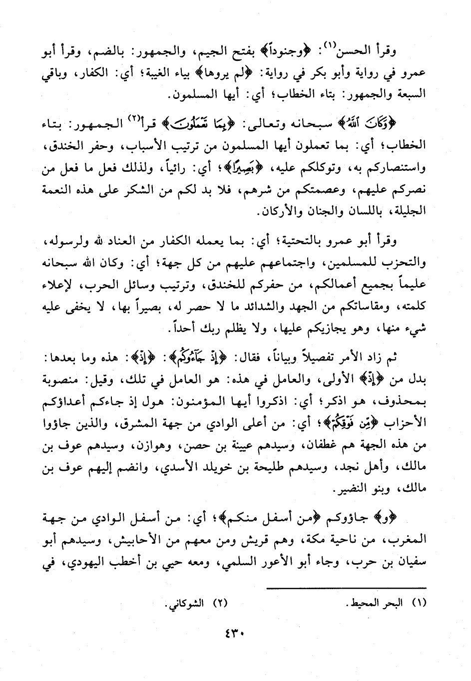 {وَكَانَ اللَّهُ} سبحانه وتعالى: {بِمَا تَعْمَلُونَ} قرأ (¬2) الجمهور: بتاء الخطاب؛ أي: بما تعملون أيها المسلمون من ترتيب الأسباب، وحفر الخندق، واستنصاركم به، وتوكلكم عليه، {بَصِيرًا}؛ أي: رائيًا، ولذلك فعل ما فعل من نصركم عليهم، وعصمتكم من شرهم، فلا بد لكم من الشكر على هذه النعمة الجليلة، باللسان والجنان والأركان.