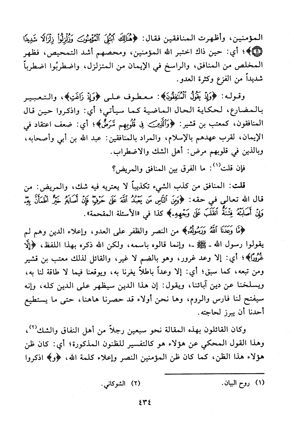 12 - وقوله: {وَإِذْ يَقُولُ الْمُنَافِقُونَ}: معطوف على {وَإِذْ زَاغَتِ}، والتعبير بالمضارع، لحكاية الحال الماضية كما سيأتي؛ أي: واذكروا حين قال المنافقون، كمعتب بن قشير: {وَالَّذِينَ فِي قُلُوبِهِمْ مَرَضٌ}؛ أي: ضعف اعتقاد في الإيمان, لقرب عهدهم بالإِسلام، والمراد بالمنافقين: عبد الله بن أبي وأصحابه، وبالذين في قلوبهم مرض: أهل الشك والاضطراب.