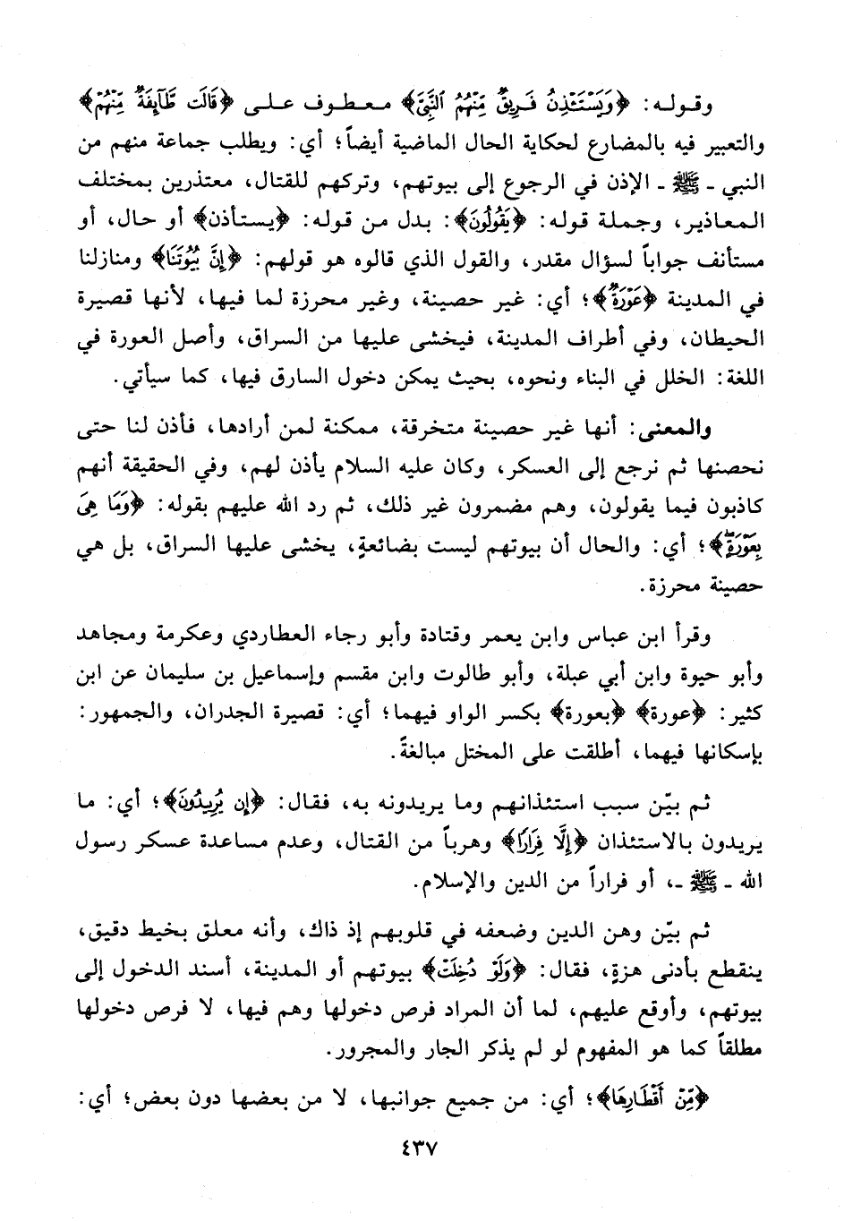 وقوله: {وَيَسْتَأْذِنُ فَرِيقٌ مِنْهُمُ النَّبِيَّ} معطوف على {قَالَتْ طَائِفَةٌ مِنْهُمْ} والتعبير فيه بالمضارع لحكاية الحال الماضية أيضًا؛ أي: ويطلب جماعة منهم من النبي - صلى الله عليه وسلم - الإذن في الرجوع إلى بيوتهم، وتركهم للقتال، معتذرين بمختلف المعاذير، وجملة قوله: {يَقُولُونَ}: بدل من قوله: {يستأذن} أو حال، أو مستأنف جوابًا لسؤال مقدر، والقول الذي قالوه هو قولهم: {إِنَّ بُيُوتَنَا} ومنازلنا في المدينة {عَوْرَةٌ}؛ أي: غير حصينة، وغير محرزة لما فيها, لأنها قصيرة الحيطان، وفي أطراف المدينة، فيخشى عليها من السراق، وأصل العورة في اللغة: الخلل في البناء ونحوه، بحيث يمكن دخول السارق فيها، كما سيأتي.