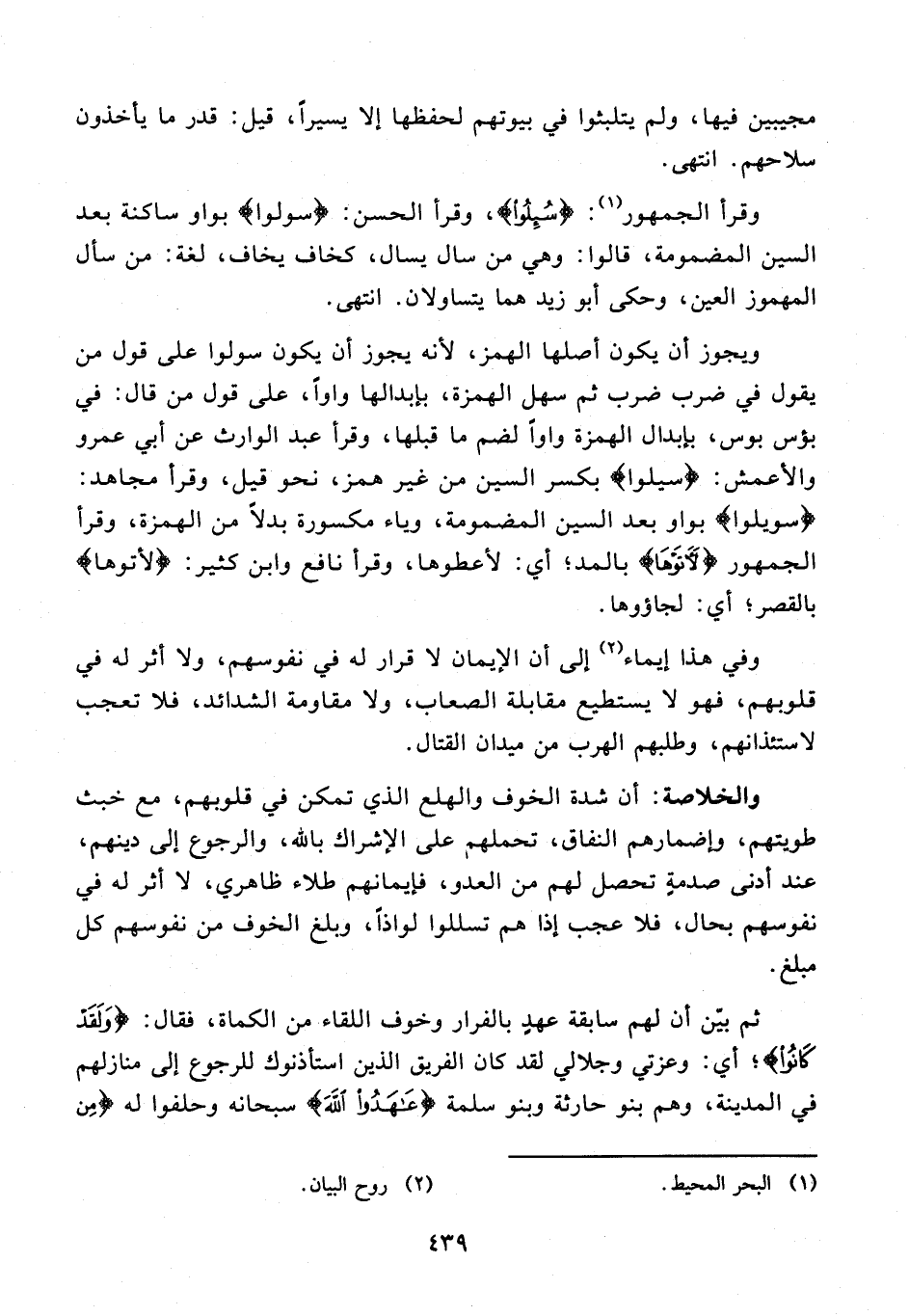 ويجوز أن يكون أصلها الهمز, لأنه يجوز أن يكون سولوا على قول من يقول في ضرب ضرب ثم سهل الهمزة، بإبدالها واوًا، على قول من قال: في بؤس بوس، بإبدال الهمزة واوًا لضم ما قبلها، وقرأ عبد الوارث عن أبي عمرو والأعمش: {سيلوا} بكسر السين من غير همز، نحو قيل، وقرأ مجاهد: {سويلوا} بواو بعد السين المضمومة، وياء مكسورة بدلًا من الهمزة، وقرأ الجمهور {لَآتَوْهَا} بالمد؛ أي: لأعطوها، وقرأ نافع وابن كثير: {لأتوها} بالقصر؛ أي: لجاؤوها.