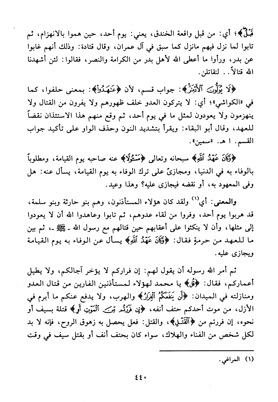 والمعنى: أي (¬1) ولقد كان هؤلاء المستأذنون، وهم بنو حارثة وبنو سلمة، قد هربوا يوم أحد، وفروا من لقاء عدوهم، ثم تابوا وعاهدوا الله أن لا يعودوا إلى مثلها، وأن لا ينكثوا على أعقابهم حين قتالهم مع رسول الله - صلى الله عليه وسلم -، ثم بين ما للعهد من حرمةٍ فقال: {وَكَانَ عَهْدُ اللَّهِ} يسأل عن الوفاء به يوم القيامة ويجازى عليه.