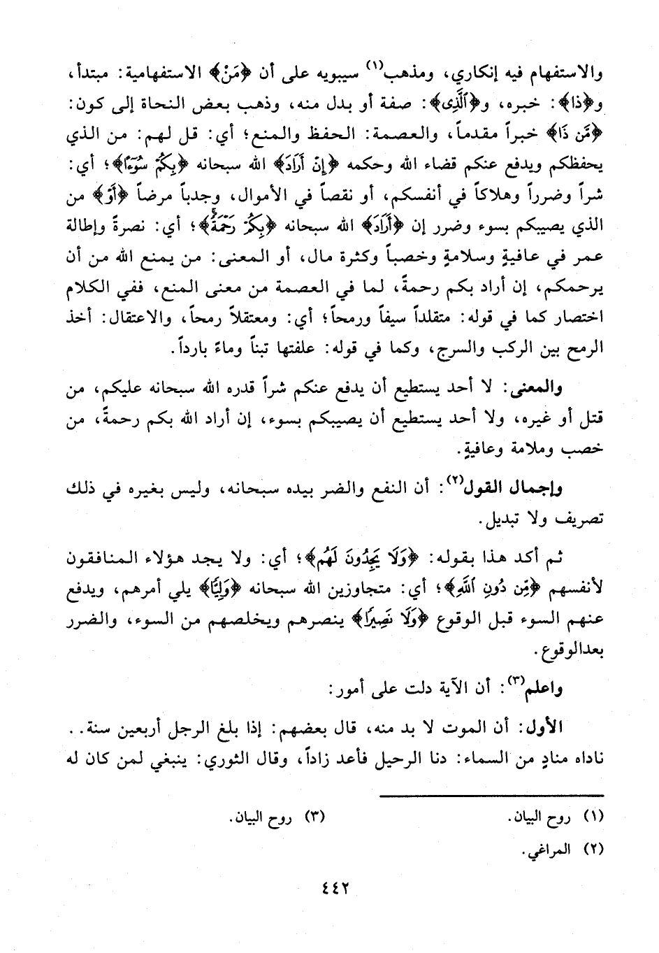 والمعنى: لا أحد يستطيع أن يدفع عنكم شرًا قدره الله سبحانه عليكم، من قتل أو غيره، ولا أحد يستطيع أن يصيبكم بسوء، إن أراد الله بكم رحمةً، من خصب وملامة وعافيةٍ.