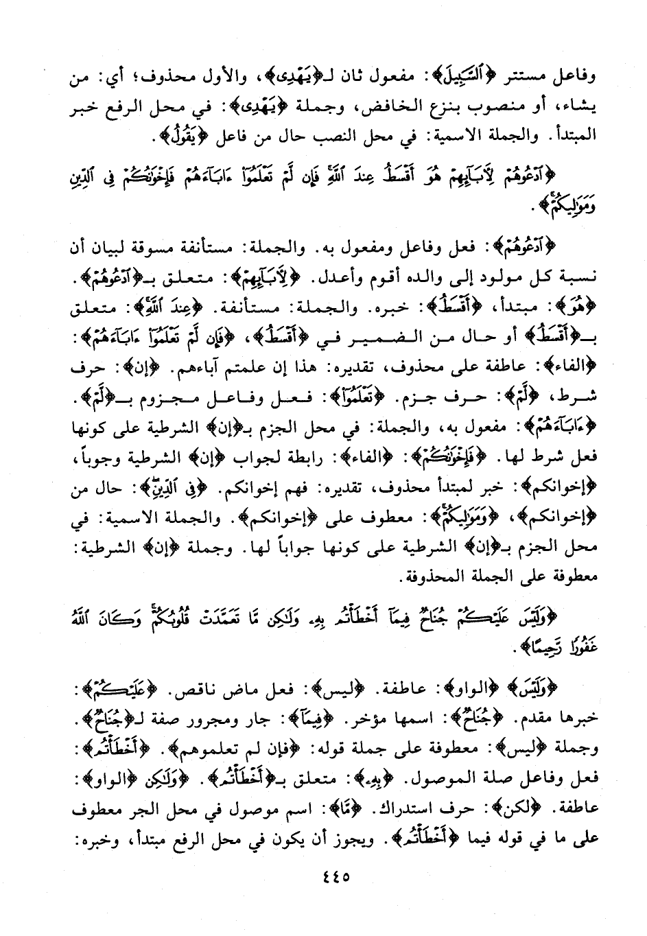 {ادْعُوهُمْ}: فعل وفاعل ومفعول به. والجملة: مستأنفة مسوقة لبيان أن نسبة كل مولود إلى والده أقوم وأعدل. {لِآبَائِهِمْ}: متعلق بـ {ادْعُوهُمْ}. {هُوَ}: مبتدأ، {أَقْسَطُ}: خبره. والجملة: مستأنفة. {عِنْدَ اللَّهِ}: متعلق بـ {أَقْسَطُ} أو حال من الضمير في {أَقْسَطُ}، {فَإِنْ لَمْ تَعْلَمُوا آبَاءَهُمْ}: {الفاء}: عاطفة على محذوف، تقديره: هذا إن علمتم آباءهم. {إن}: حرف شرط، {لَمْ}: حرف جزم. {تَعْلَمُوا}: فعل وفاعل مجزوم بـ {لَمْ}. {آبَاءَهُمْ}: مفعول به، والجملة: في محل الجزم بـ {إن} الشرطية على كونها فعل شرط لها. {فَإِخْوَانُكُمْ}: {الفاء}: رابطة لجواب {إن} الشرطية وجوبًا، {إخوانكم}: خبر لمبتدأ محذوف، تقديره: فهم إخوانكم. {فِي الدِّينِ}: حال من {إخوانكم}، {وَمَوَالِيكُمْ}: معطوف على {إخوانكم}. والجملة الاسمية: في محل الجزم بـ {إن} الشرطية على كونها جوابًا لها. وجملة {إن} الشرطية: معطوفة على الجملة المحذوفة.
