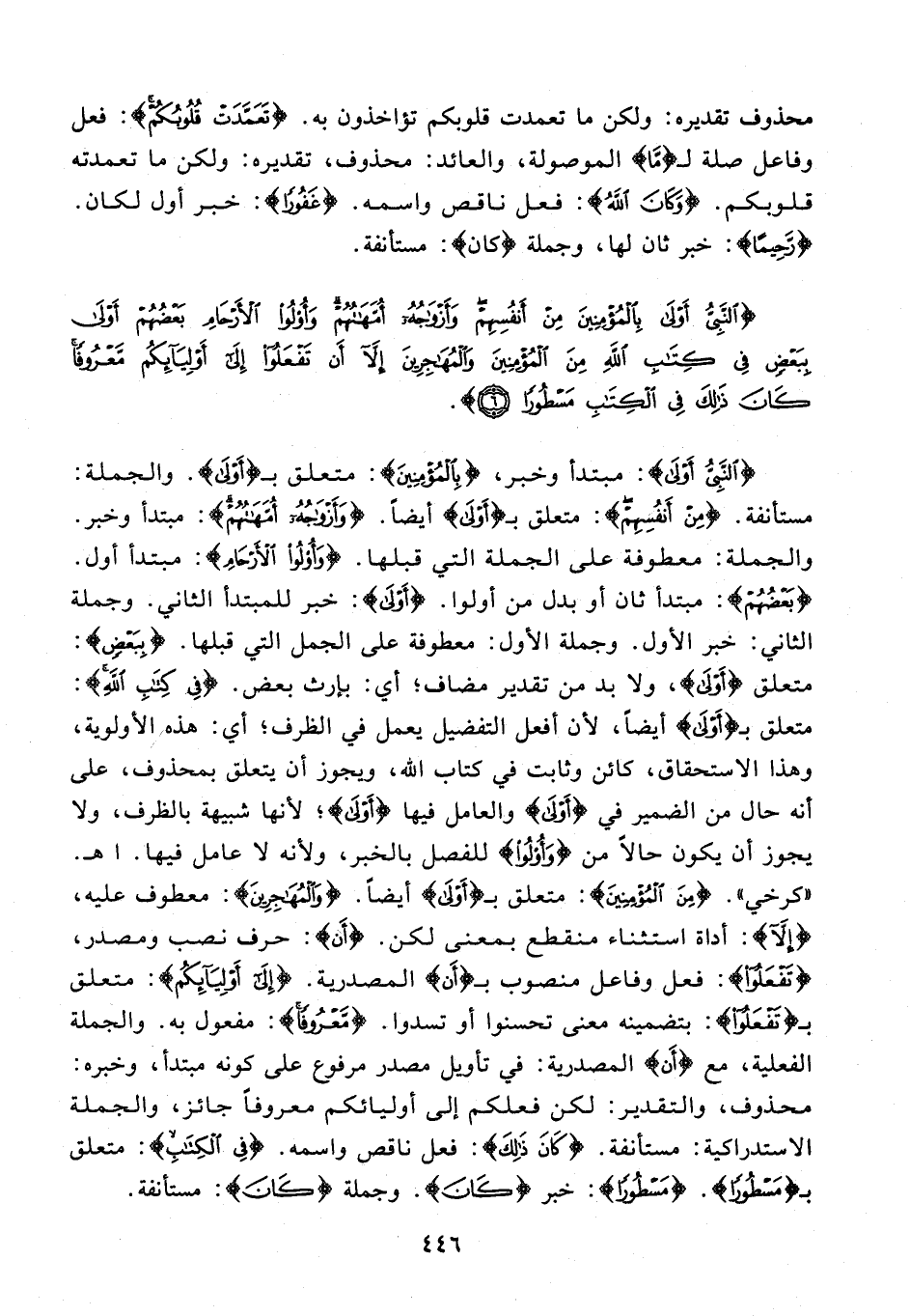 {النَّبِيُّ أَوْلَى}: مبتدأ وخبر، {بِالْمُؤْمِنِينَ}: متعلق بـ {أَوْلَى}. والجملة: مستأنفة. {مِنْ أَنْفُسِهِمْ}: متعلق بـ {أَوْلَى} أيضًا. {وَأَزْوَاجُهُ أُمَّهَاتُهُمْ}: مبتدأ وخبر. والجملة: معطوفة على الجملة التي قبلها. {وَأُولُو الْأَرْحَامِ}: مبتدأ أول. {بَعْضُهُمْ}: مبتدأ ثان أو بدل من أولوا. {أَوْلَى}: خبر للمبتدأ الثاني. وجملة الثاني: خبر الأول. وجملة الأول: معطوفة على الجمل التي قبلها. {بِبَعْضٍ}: متعلق {أَوْلَى}، ولا بد من تقدير مضاف؛ أي: بإرث بعض. {فِي كِتَابِ اللَّهِ}: متعلق بـ {أَوْلَى} أيضًا؛ لأن أفعل التفضيل يعمل في الظرف؛ أي: هذه الأولوية، وهذا الاستحقاق، كائن وثابت في كتاب الله، ويجوز أن يتعلق بمحذوف، على أنه حال من الضمير في {أَوْلَى} والعامل فيها {أَوْلَى}؛ لأنها شبيهة بالظرف، ولا يجوز أن يكون حالًا من {وَأُولُو} للفصل بالخبر، ولأنه لا عامل فيها. اهـ. "كرخي". {مِنَ الْمُؤْمِنِينَ}: متعلق بـ {أَوْلَى} أيضًا. {وَالْمُهَاجِرِينَ}: معطوف عليه، {إِلَّا}: أداة استثناء منقطع بمعنى لكن. {أَنْ}: حرف نصب ومصدر، {تَفْعَلُوا}: فعل وفاعل منصوب بـ {أَنْ} المصدرية. {إِلَى أَوْلِيَائِكُمْ}: متعلق بـ {تَفْعَلُوا}: بتضمينه معنى تحسنوا أو تسدوا. {مَعْرُوفًا}: مفعول به. والجملة الفعلية، مع {أَنْ} المصدرية: في تأويل مصدر مرفوع على كونه مبتدأ، وخبره: محذوف، والتقدير: لكن فعلكم إلى أوليائكم معروفًا جائز، والجملة الاستدراكية: مستأنفة. {كَانَ ذَلِكَ}: فعل ناقص واسمه. {فِي الْكِتَابِ}: متعلق بـ {مَسْطُورًا}. {مَسْطُورًا}. خبر {كَانَ}: وجملة {كَانَ}: مستأنفة.