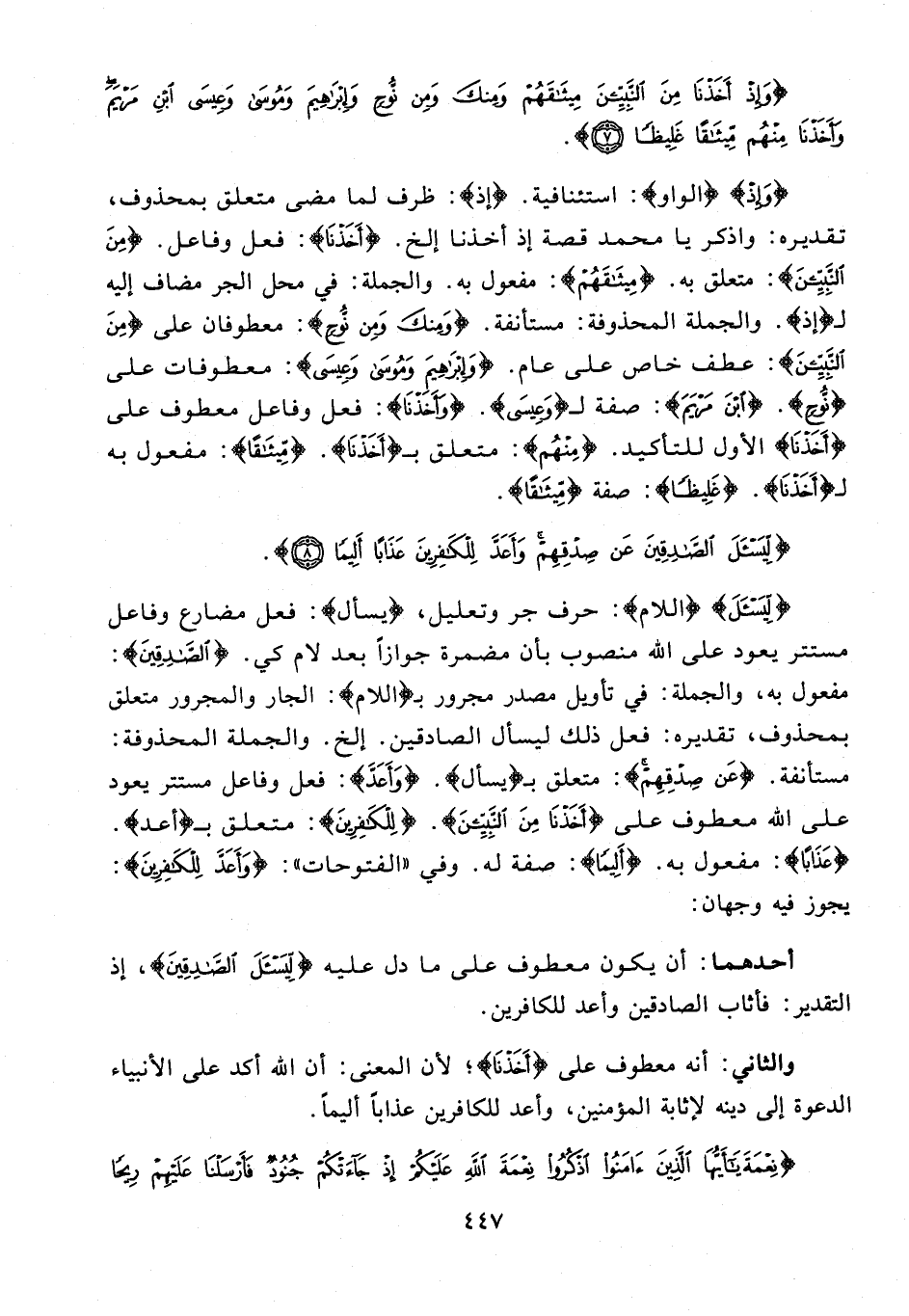{وَإِذْ} {الواو}: استئنافية. {إذ}: ظرف لما مضى متعلق بمحذوف، تقديره: واذكر يا محمد قصة إذ أخذنا إلخ. {أَخَذْنَا}: فعل وفاعل. {مِنَ النَّبِيِّينَ}: متعلق به. {مِيثَاقَهُمْ}: مفعول به. والجملة: في محل الجر مضاف إليه لـ {إذ}. والجملة المحذوفة: مستأنفة. {وَمِنْكَ وَمِنْ نُوحٍ}: معطوفان على {مِنَ النَّبِيِّينَ}: عطف خاص على عام. {وَإِبْرَاهِيمَ وَمُوسَى وَعِيسَى}: معطوفات على {نُوحٍ}. {ابْنِ مَرْيَمَ}: صفة لـ {وَعِيسَى}. {وَأَخَذْنَا}: فعل وفاعل معطوف على لـ {أَخَذْنَا} الأول للتأكيد. {مِنْهُمْ}: متعلق بـ {أَخَذْنَا}. {مِيثَاقًا}: مفعول به لـ {أَخَذْنَا}. {غَلِيظًا}: صفة {مِيثَاقًا}.