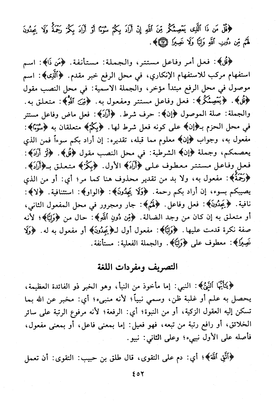 {قُلْ}: فعل أمر وفاعل مستتر، والجملة: مستأنفة. {مَنْ ذَا}: اسم استفهام مركب للاستفهام الإنكاري، في محل الرفع خبر مقدم. {الَّذِي}: اسم موصول في محل الرفع مبتدأ مؤخر، والجملة الاسمية: في مجل النصب مقول {قُلْ}. {يَعْصِمُكُمْ}: فعل وفاعل مستتر ومفعول به. {مِنَ اللَّهِ}: متعلق به. والجملة: صلة الموصول {إن}: حرف شرط. {أَرَادَ}: فعل ماض وفاعل مستتر في محل الحزم بـ {إن} على كونه فعل شرط لها. {بِكُمْ} متعلقان به {سُوءًا}: مفعول به، وجواب {إن} معلوم مما قبله، تقديره: إن أراد بكم سوءًا فمن الذي يعصمكم، وجملة {إن} الشرطية: في محل النصب مقول {قُلْ}. {أَوْ أَرَادَ}: فعبم وفاعل مستتر معطوف على {أَرَادَ} الأول. {بِكُمْ} متعلق بـ {أَرَادَ}. {رَحْمَةً}: مفعول به، ولا بد من تقدير محذوف هنا كما مر؛ أي: أو من الذي يصيبكم بسوء، إن أراد بكم رحمة. {وَلَا يَجِدُونَ}: {الواو}: استئنافية. {لا}: نافية. {يَجِدُونَ}: فعل وفاعل. {لَهُمْ}: جار وجرور في محل المفعول الثاني، أو متعلق به إن كان من وجد الضالة. {مِنْ دُونِ اللَّهِ}: حال من {وَلِيًّا}؛ لأنه صفة نكرة قدمت عليها. {وَلِيًّا}: مفعول أول لـ {يَجِدُونَ} أو مفعول به له. {وَلَا نَصِيرًا}: معطوف على {وَلِيًّا}. والجملة الفعلية: مستأنفة.