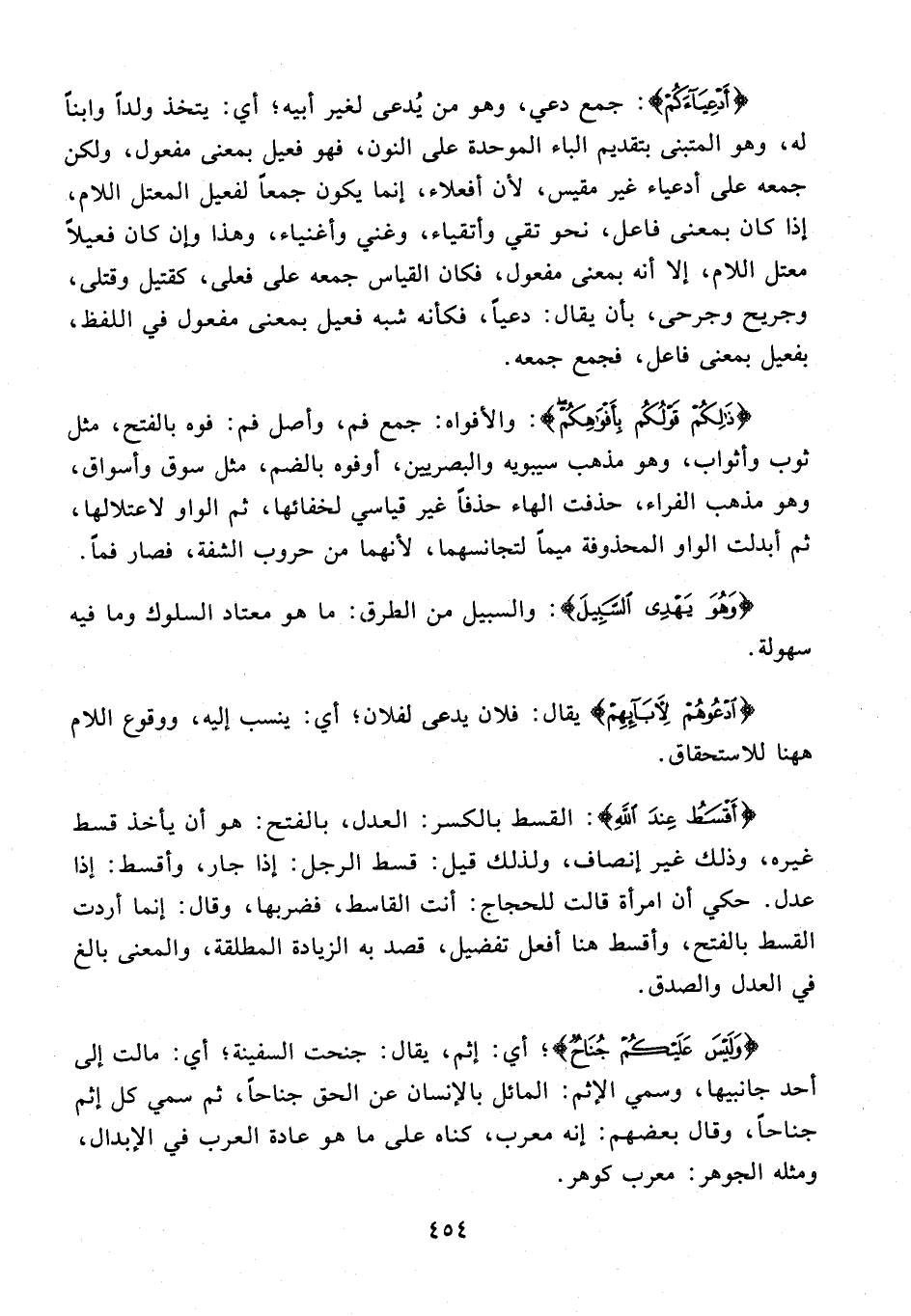 {أَدْعِيَاءَكُمْ}: جمع دعي، وهو من يُدعى لغير أبيه؛ أي: يتخذ ولدًا وابنًا له، وهو المتبنى بتقديم الباء الموحدة على النون، فهو فعيل بمعنى مفعول، ولكن جمعه على أدعياء غير مقيس, لأن أفعلاء، إنما يكون جمعًا لفعيل المعتل اللام، إذا كان بمعنى فاعل، نحو تقي وأتقياء، وغني وأغنياء، وهذا وإن كان فعيلًا معتل اللام، إلا أنه بمعنى مفعول، فكان القياس جمعه على فعلى، كقتيل وقتلى، وجريح وجرحى، بأن يقال: دعيًا، فكأنه شبه فعيل بمعنى مفعول في اللفظ، بفعيل بمعنى فاعل، فجمع جمعه.