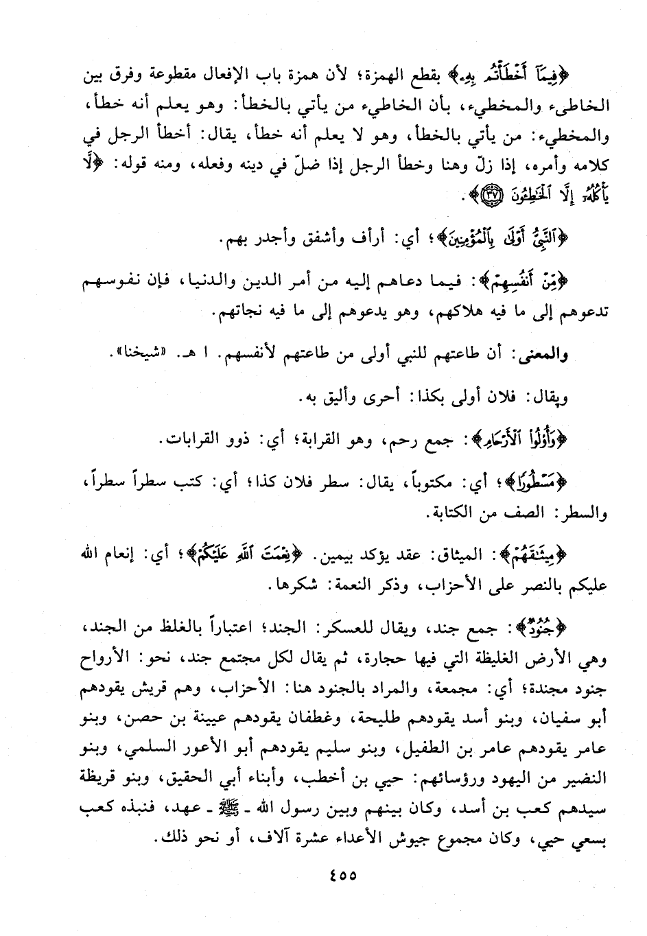 {فِيمَا أَخْطَأْتُمْ بِهِ} بقطع الهمزة؛ لأن همزة باب الإفعال مقطوعة وفرق بين الخاطىء والمخطيء، بأن الخاطيء من يأتي بالخطأ: وهو يعلم أنه خطأ، والمخطيء: من يأتي بالخطأ، وهو لا يعلم أنه خطأ، يقال: أخطأ الرجل في كلامه وأمره، إذا زلّ وهنا وخطأ الرجل إذا ضلّ في دينه وفعله، ومنه قوله: {لَا يَأْكُلُهُ إِلَّا الْخَاطِئُونَ (37)}.