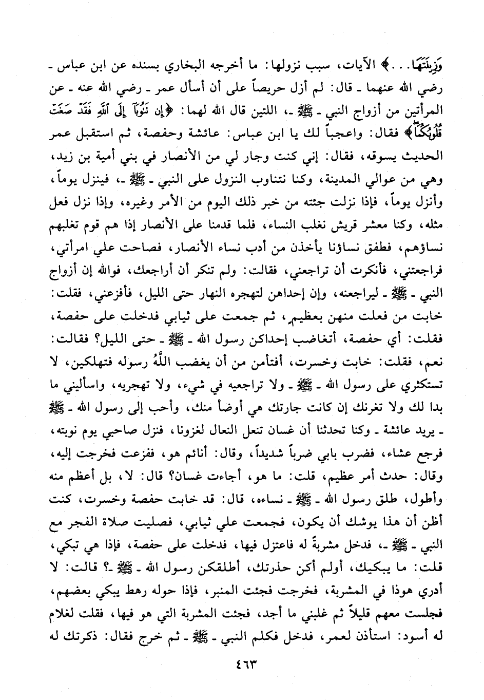 وَزِينَتَهَا ...} الآيات، سبب نزولها: ما أخرجه البخاري بسنده عن ابن عباس - رضي الله عنهما - قال: لم أزل حريصًا على أن أسال عمر - رضي الله عنه - عن المرأتين من أزواج النبي - صلى الله عليه وسلم -، اللتين قال الله لهما: {إِنْ تَتُوبَا إِلَى اللَّهِ فَقَدْ صَغَتْ قُلُوبُكُمَا} فقال: واعجبًا لك يا ابن عباس: عائشة وحفصة، ثم استقبل عمر الحديث يسوقه، فقال: إني كنت وجار لي من الأنصار في بني أمية بن زيد، وهي من عوالي المدينة، وكنا نتناوب النزول على النبي - صلى الله عليه وسلم -، فينزل يومًا، وأنزل يومًا، فإذا نزلت جئته من خبر ذلك اليوم من الأمر وغيره، وإذا نزل فعل مثله، وكنا معشر قريش نغلب النساء، فلما قدمنا على الأنصار إذا هم قوم تغلبهم نساؤهم، فطفق نساؤنا يأخذن من أدب نساء الأنصار، فصاحت علي امرأتي، فراجعتني، فأنكرت أن تراجعني، فقالت: ولم تنكر أن أراجعك، فوالله إن أزواج النبي - صلى الله عليه وسلم - ليراجعنه، وإن إحداهن لتهجره النهار حتى الليل، فأفزعني، فقلت: خابت من فعلت منهن بعظيمٍ، ثم جمعت على ثيابي فدخلت على حفصة، فقلت: أي حفصة، أتغاضب إحداكن رسول الله - صلى الله عليه وسلم - حتى الليل؟ فقالت: نعم، فقلت: خابت وخسرت، أفتأمن من أن يغضب الله رسوله فتهلكين، لا تستكثري على رسول الله - صلى الله عليه وسلم - ولا تراجعيه في شيء، ولا تهجريه، واسأليني ما بدا لك ولا تغرنك إن كانت جارتك هي أوضأ منك، وأحب إلى رسول الله - صلى الله عليه وسلم - يريد عائشة - وكنا تحدثنا أن غسان تنعل النعال لغزونا، فنزل صاحبي يوم نوبته، فرجع عشاء، فضرب بأبي ضربًا شديدًا، وقال: أنائم هو، ففزعت فخرجت إليه، وقال: حدث أمر عظيم، قلت: ما هو، أجاءت غسان؟ قال: لا، بل أعظم منه وأطول، طلق رسول الله - صلى الله عليه وسلم - نساءه، قال: قد خابت حفصة وخسرت، كنت أظن أن هذا يوشك أن يكون، فجمعت علي ثيابي، فصليت صلاة الفجر مع النبي - صلى الله عليه وسلم -، فدخل مشربةً له فاعتزل فيها، فدخلت على حفصة، فإذا هي تبكي، قلت: ما يبكيك، أولم أكن حذرتك، أطلقكن رسول الله - صلى الله عليه وسلم -؟ قالت: لا أدري هوذا في المشربة، فخرجت فجئت المنبر، فإذا حوله رهط يبكي بعضهم، فجلست معهم قليلًا ثم غلبني ما أجد، فجئت المشربة التي هو فيها، فقلت لغلام له أسود: استأذن لعمر، فدخل فكلم النبي - صلى الله عليه وسلم - ثم خرج فقال: ذكرتك له