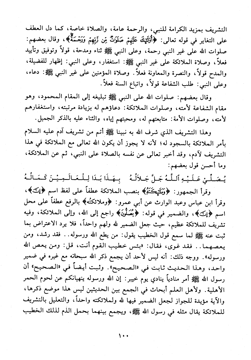 وقرأ الجمهور: {وَمَلَائِكَتَهُ} بنصب الملائكة عطفًا على لفظ اسم {إِنَّ}، وقرأ ابن عباس وعبد الوارث عن أبي عمرو: {وملائكتُه} بالرفع عطفًا على محل اسم {إِنَّ}، والضمير في قوله: {يُصَلُّونَ} راجع إلى الله، وإلى الملائكة، وفيه تشريف للملائكة عظيم، حيث جعل الضمير لله ولهم واحدًا، فلا يرد الاعتراض بما ثبت عنه - صلى الله عليه وسلم - لما سمع قول الخطيب يقول: من يطع الله ورسوله .. فقد رشد، ومن يعصهما .. فقد غوى، فقال: "بئس خطيب القوم أنت، قل: ومن يعصى الله ورسوله". ووجه ذلك: أنه ليس لأحد أن يجمع ذكر الله سبحانه مع غيره في ضمير واحد، وهذا الحديث ثابت في "الصحيح". وثبت أيضًا في "الصحيح" أن رسول الله - صلى الله عليه وسلم - أمر مناديًا ينادي يوم خيبر: إن الله ورسوله ينهيانكم عن لحوم الحمر الأهلية. ولأهل العلم أبحاث في الجمع بين الحديثين ليس هذا موضع ذكرها، والآية مؤيدة للجواز لجعل الضمير فيها لله ولملائكته واحدًا، والتعليل بالتشريف للملائكة يقال مثله في رسول الله - صلى الله عليه وسلم -، ويجمع بينهما يحمل الذم لذلك الخطيب