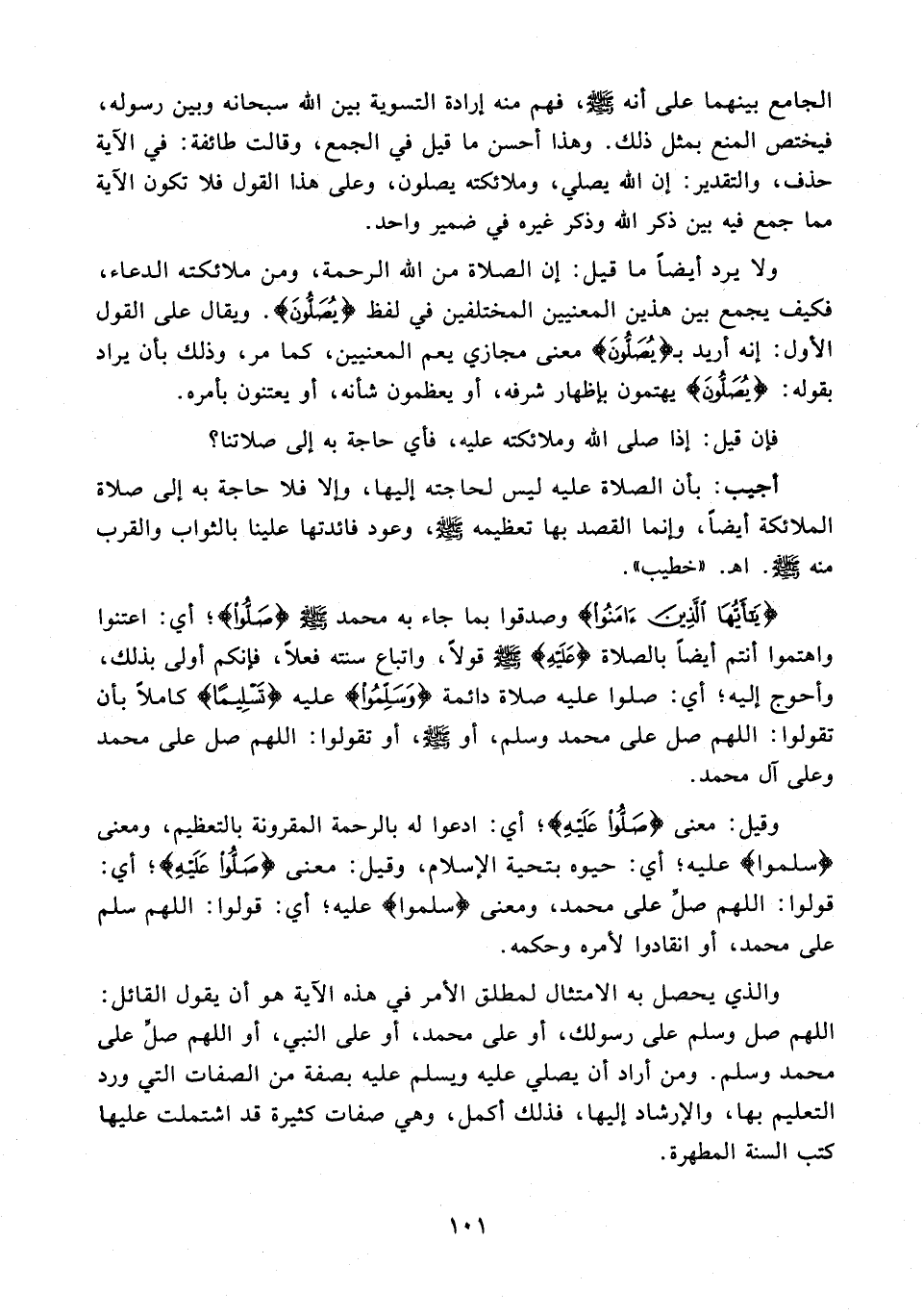 والذي يحصل به الامتثال لمطلق الأمر في هذه الآية هو أن يقول القائل: اللهم صل وسلم على رسولك، أو على محمد، أو على النبي، أو اللهم صلِّ على محمد وسلم. ومن أراد أن يصلي عليه وسلم عليه بصفة من الصفات التي ورد التعليم بها، والإرشاد إليها، فذلك أكمل، وهي صفات كثيرة قد اشتملت عليها كتب السنة المطهرة.
