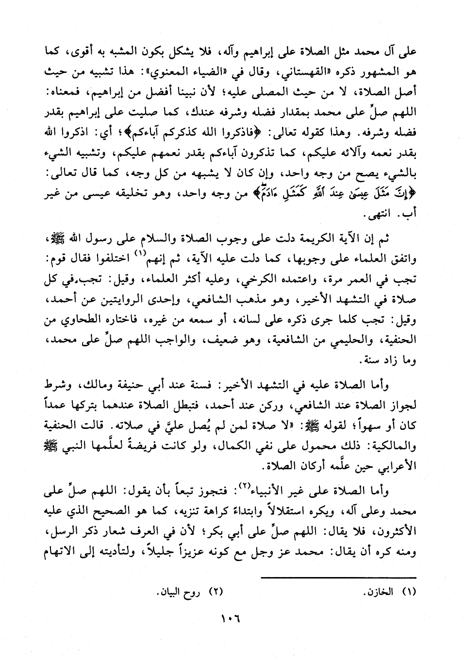 على آل محمد مثل الصلاة على إبراهيم وآله، فلا يشكل يكون المشبه به أقوى، كما هو المشهور ذكره "القهستاني"، وقال في "الضياء المعنوي": هذا تشبيه من حيث أصل الصلاة، لا من حيث المصلى عليه؛ لأن نبينا أفضل من إبراهيم، فمعناه: اللهم صلِّ على محمد بمقدار فضله وشرفه عندك، كما صليت على إبراهيم بقدر فضله وشرفه. وهذا كقوله تعالى: {فَاذْكُرُوا اللَّهَ كَذِكْرِكُمْ آبَاءَكُمْ}؛ أي: اذكروا الله بقدر نعمه وآلائه عليكم، كما تذكرون آباءكم بقدر نعمهم عليكم، وتشبيه الشيء بالشيء يصح من وجه واحد، وإن كان لا يشبهه من كل وجه، كما قال تعالى: {إِنَّ مَثَلَ عِيسَى عِنْدَ اللَّهِ كَمَثَلِ آدَمَ} من وجه واحد، وهو تخليقه عيسى من غير أب. انتهى.