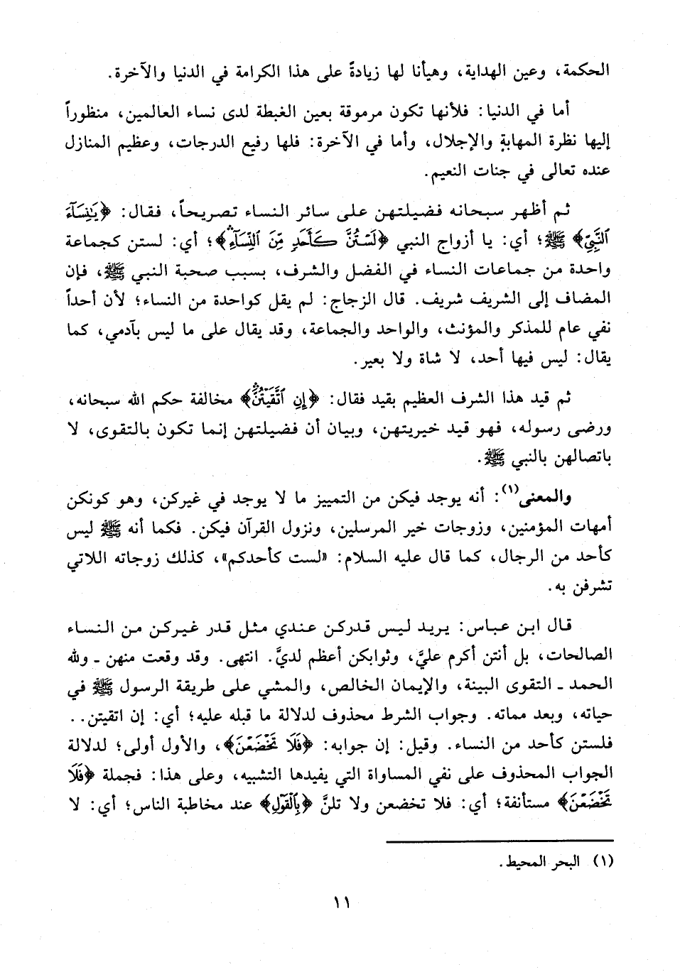 32 - ثم أظهر سبحانه فضيلتهن على سائر النساء تصريحًا، فقال: {يَا نِسَاءَ النَّبِيِّ} - صلى الله عليه وسلم -؛ أي: يا أزواج النبي {لَسْتُنَّ كَأَحَدٍ مِنَ النِّسَاءِ}؛ أي: لستن كجماعة واحدة من جماعات النساء في الفضل والشرف، بسبب صحبة النبي - صلى الله عليه وسلم -، فإن المضاف إلى الشريف شريف. قال الزجاج: لم يقل كواحدة من النساء؛ لأن أحدًا نفي عام للمذكر والمؤنث، والواحد والجماعة، وقد يقال على ما ليس بآدمي، كما يقال: ليس فيها أحد، لا شاة ولا بعير.