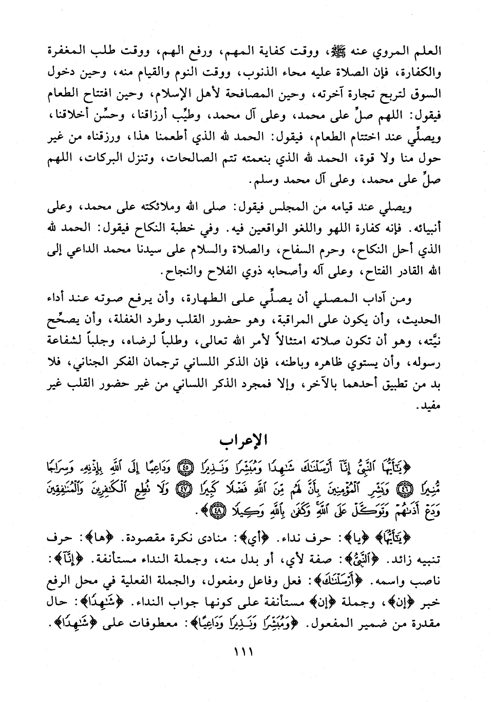 العلم المروي عنه - صلى الله عليه وسلم -، ووقت كفاية المهم، ورفع الهم، ووقت طلب المغفرة والكفارة، فإن الصلاة عليه محاء الذنوب، ووقت النوم والقيام منه، وحين دخول السوق لتربح تجارة آخرته، وحين المصافحة لأهل الإِسلام، وحين افتتاح الطعام فيقول: اللهم صلِّ على محمد، وعلى آل محمد، وطيِّب أرزاقنا، وحسِّن أخلاقنا، ويصلي عند اختتام الطعام، فيقول: الحمد لله الذي أطعمنا هذا، ورزقناه من غير حول منا ولا قوة، الحمد لله الذي بنعمته تتم الصالحات، وتنزل البركات، اللهم صلِّ على محمد، وعلى آل محمد وسلم.