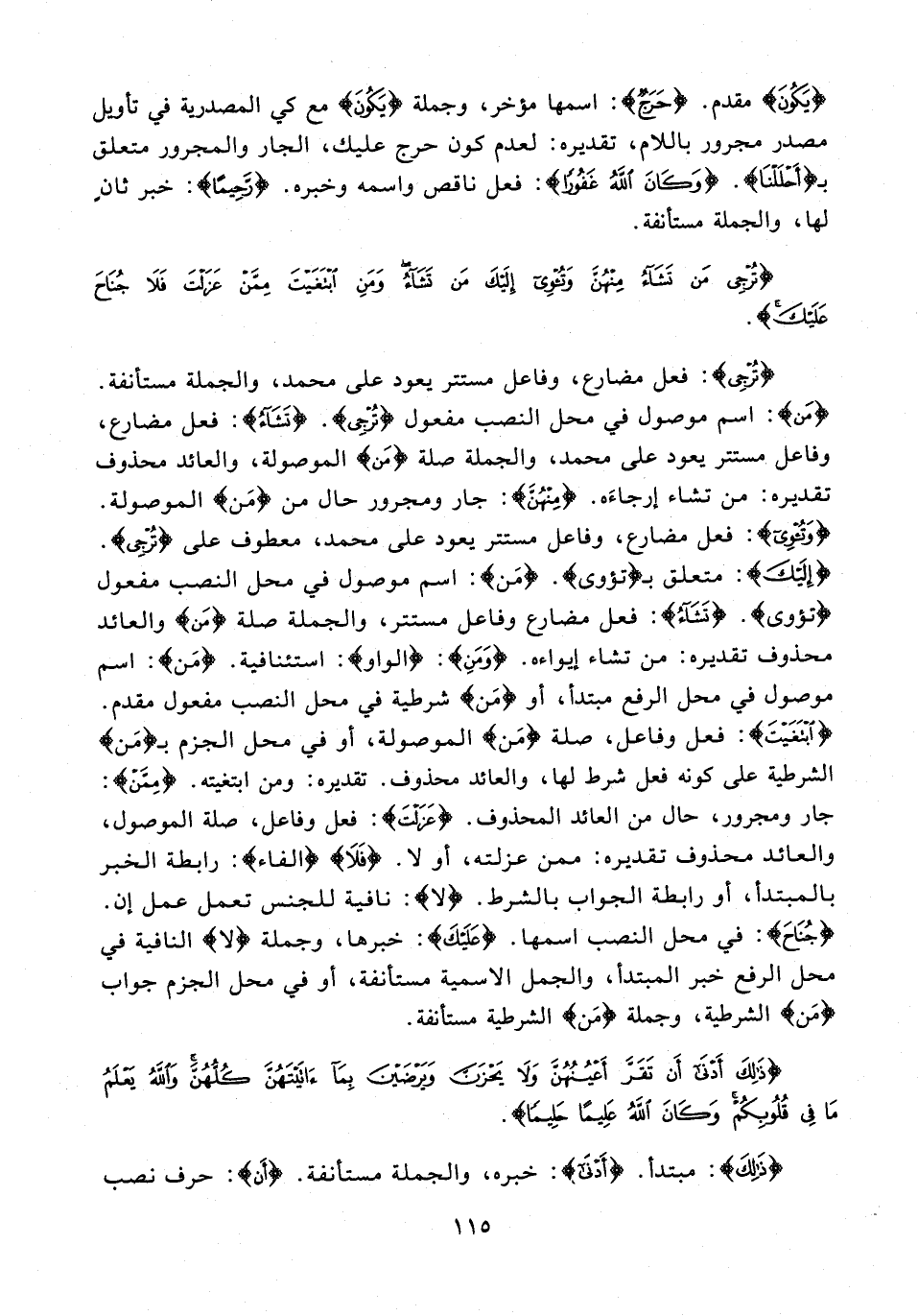 {تُرْجِي}: فعل مضارع، وفاعل مستتر يعود على محمد، والجملة مستأنفة. {مَن}: اسم موصول في محل النصب مفعول {تُرْجِي}. {تَشَاءُ}: فعل مضارع، وفاعل مستتر يعود على محمد، والجملة صلة {مَن} الموصولة، والعائد محذوف تقديره: من تشاء إرجاءَه. {مِنْهُنَّ}: جار ومجرور حال من {مَن} الموصولة. {وَتُؤْوِي}: فعل مضارع، وفاعل مستتر يعود على محمد، معطوف على {تُرْجِي}. {إِلَيْكَ}: متعلق بـ {تُؤْوِي}. {مَن}: اسم موصول في محل النصب مفعول {تؤوى}. {تَشَاءُ}: فعل مضارع وفاعل مستتر، والجملة صلة {مَن} والعائد محذوف تقديره: من تشاء إيواءه. {وَمَنِ}: {الواو}: استئنافية. {مَن}: اسم موصول في محل الرفع مبتدأ، أو {مَن} شرطية في محل النصب مفعول مقدم. {ابْتَغَيْتَ}: فعل وفاعل، صلة {مَن} الموصولة، أو في محل الجزم بـ {مَن} الشرطية على كونه فعل شرط لها، والعائد محذوف. تقديره: ومن ابتغيته. {مِمَّنْ}: جار ومجرور، حال من العائد المحذوف. {عَزَلْتَ}: فعل وفاعل، صلة الموصول، والعائد محذوف تقديره: ممن عزلته، أو لا. {فَلَا} {الفاء}: رابطة الخبر بالمبتدأ، أو رابطة الجواب بالشرط. {لا}: نافية للجنس تعمل عمل إن. {جُنَاحَ}: في محل النصب اسمها. {عَلَيْكَ}: خبرها، وجملة {لا} النافية في محل الرفع خبر المبتدأ، والجمل الاسمية مستأنفة، أو في محل الجزم جواب {مَن} الشرطية، وجملة {مَن} الشرطية مستأنفة.
