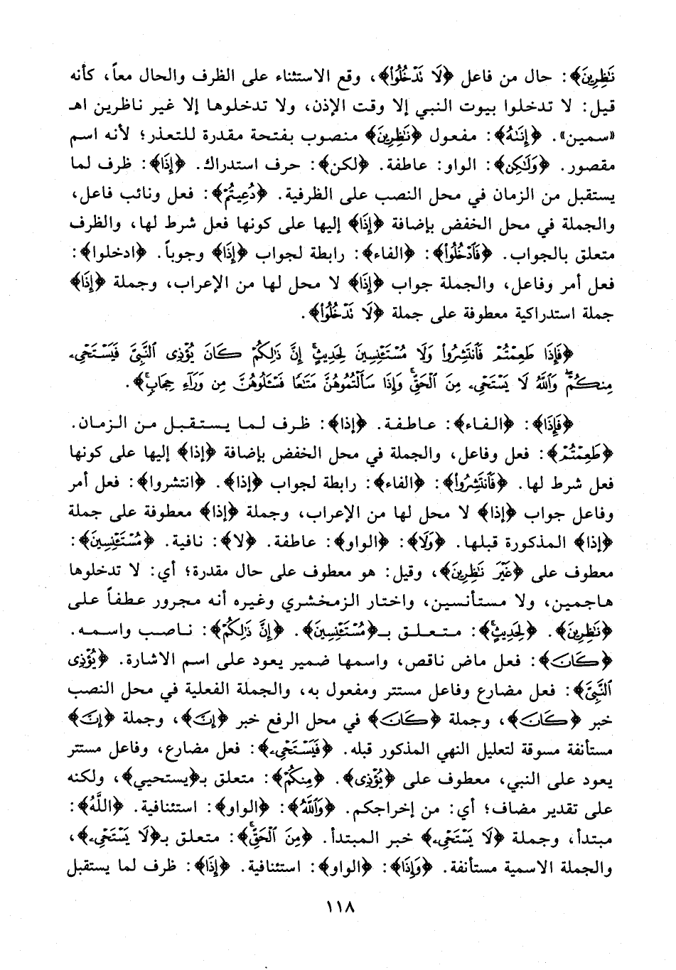 نَظِرينَ}: حال من فاعلًا {لَا تَدْخُلُوا}، وقع الاستثناء على الظرف والحال معًا، كأنه قيل: لا تدخلوا بيوت النبي إلا وقت الإذن، ولا تدخلوها إلا غير ناظرين اهـ "سمين". {إِنَاهُ}: مفعول {نَاظِرِينَ} منصوب بفتحة مقدرة للتعذر؛ لأنه اسم مقصور. {وَلَكِنْ}: الواو: عاطفة. {لكن}: حرف استدراك. {إِذَا}: ظرف لما يستقبل من الزمان في محل النصب على الظرفية. {دُعِيتُمْ}: فعل ونائب فاعل، والجملة في محل الخفض بإضافة {إِذَا} إليها على كونها فعل شرط لها، والظرف متعلق بالجواب. {فَادْخُلُوا}: {الفاء}: رابطة لجواب {إِذَا} وجوبًا. {ادخلوا}: فعل أمر وفاعل، والجملة جواب {إِذَا} لا محل لها أو الإعراب، وجملة {إِذَا} جملة استدراكية معطوفة على جملة {لَا تَدْخُلُوا}.