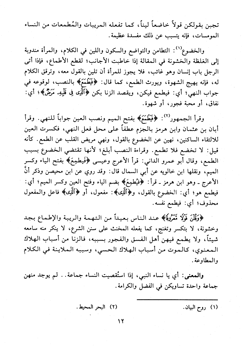 تجبن بقولكن قولًا خاضعًا لينًا، كما تفعله المريبات والمُطمعات من النساء المومسات، فإنه يتسبب عن ذلك مفسدة عظيمة.