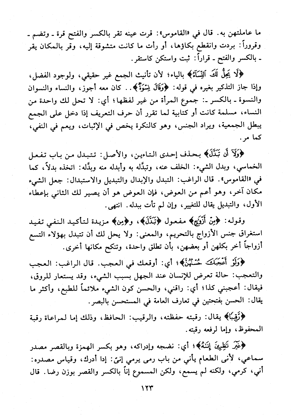 {لَا يَحِلُّ لَكَ النِّسَاءُ} بالياء؛ لأن تأنيث الجمع غير حقيقي، ولوجود الفضل، وإذا جاز التذكير بغيره في قوله: {وَقَالَ نِسْوَةٌ} .. كان معه أجوز، والنساء والنسوان والنسوة - بالكسر -: جموع المرأة من غير لفظها؛ أي: لا تحل لك واحدة من النساء، مسلمة كانت أو كتابية لما تقرر أن حرف التعريف إذا دخل على الجمع يبطل الجمعية، ويراد الجنس، وهو كالنكرة يخص في الإثبات، ويعم في النفي، كما مر.