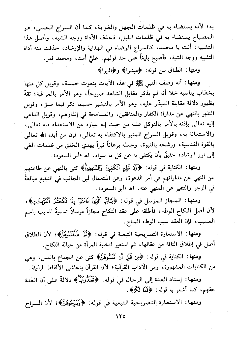 ومنها: أنه وصف النبي - صلى الله عليه وسلم - في هذه الآيات بنعوت خمسة، وقوبل كل منها بخطاب يناسبه خلا أنه لم يذكر مقابل الشاهد صريحًا، وهو الأمر بالمراقبة؛ ثقةً بظهور دلالة مقابلة المبشّر عليه، وهو الأمر بالتبشير حسبما ذكر فيما سبق، وقوبل النذير بالنهي عن مداراة الكفار والمنافقين، والمسامحة في إنذارهم، وقوبل الداعي إليه تعالى بإذنه بالأمر بالتوكل عليه من حيث إنه عبارة عن الاستعداد منه تعالى، والاستعانة به، وقوبل السراج المنير بالاكتفاء به تعالى، فإن من أيده الله تعالى بالقوة القدسية، ورشحه بالنبوة، وجعله برهانًا نيرًا يهدي الخلق من ظلمات الغي إلى نور الرشاد، حقيقٌ بأن يكتفى به عن كل ما سواه. اهـ "أبو السعود".
