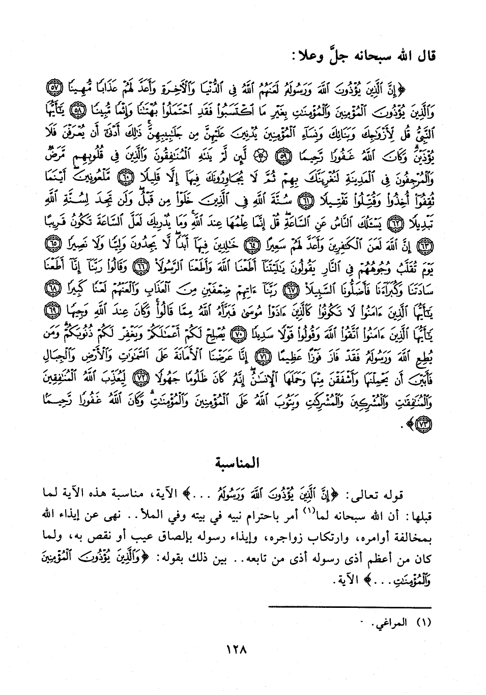 {إِنَّ الَّذِينَ يُؤْذُونَ اللَّهَ وَرَسُولَهُ لَعَنَهُمُ اللَّهُ فِي الدُّنْيَا وَالْآخِرَةِ وَأَعَدَّ لَهُمْ عَذَابًا مُهِينًا (57) وَالَّذِينَ يُؤْذُونَ الْمُؤْمِنِينَ وَالْمُؤْمِنَاتِ بِغَيْرِ مَا اكْتَسَبُوا فَقَدِ احْتَمَلُوا بُهْتَانًا وَإِثْمًا مُبِينًا (58) يَا أَيُّهَا النَّبِيُّ قُلْ لِأَزْوَاجِكَ وَبَنَاتِكَ وَنِسَاءِ الْمُؤْمِنِينَ يُدْنِينَ عَلَيْهِنَّ مِنْ جَلَابِيبِهِنَّ ذَلِكَ أَدْنَى أَنْ يُعْرَفْنَ فَلَا يُؤْذَيْنَ وَكَانَ اللَّهُ غَفُورًا رَحِيمًا (59) لَئِنْ لَمْ يَنْتَهِ الْمُنَافِقُونَ وَالَّذِينَ فِي قُلُوبِهِمْ مَرَضٌ وَالْمُرْجِفُونَ فِي الْمَدِينَةِ لَنُغْرِيَنَّكَ بِهِمْ ثُمَّ لَا يُجَاوِرُونَكَ فِيهَا إِلَّا قَلِيلًا (60) مَلْعُونِينَ أَيْنَمَا ثُقِفُوا أُخِذُوا وَقُتِّلُوا تَقْتِيلًا (61) سُنَّةَ اللَّهِ فِي الَّذِينَ خَلَوْا مِنْ قَبْلُ وَلَنْ تَجِدَ لِسُنَّةِ اللَّهِ تَبْدِيلًا (62) يَسْأَلُكَ النَّاسُ عَنِ السَّاعَةِ قُلْ إِنَّمَا عِلْمُهَا عِنْدَ اللَّهِ وَمَا يُدْرِيكَ لَعَلَّ السَّاعَةَ تَكُونُ قَرِيبًا (63) إِنَّ اللَّهَ لَعَنَ الْكَافِرِينَ وَأَعَدَّ لَهُمْ سَعِيرًا (64) خَالِدِينَ فِيهَا أَبَدًا لَا يَجِدُونَ وَلِيًّا وَلَا نَصِيرًا (65) يَوْمَ تُقَلَّبُ وُجُوهُهُمْ فِي النَّارِ يَقُولُونَ يَا لَيْتَنَا أَطَعْنَا اللَّهَ وَأَطَعْنَا الرَّسُولَا (66) وَقَالُوا رَبَّنَا إِنَّا أَطَعْنَا سَادَتَنَا وَكُبَرَاءَنَا فَأَضَلُّونَا السَّبِيلَا (67) رَبَّنَا آتِهِمْ ضِعْفَيْنِ مِنَ الْعَذَابِ وَالْعَنْهُمْ لَعْنًا كَبِيرًا (68) يَا أَيُّهَا الَّذِينَ آمَنُوا لَا تَكُونُوا كَالَّذِينَ آذَوْا مُوسَى فَبَرَّأَهُ اللَّهُ مِمَّا قَالُوا وَكَانَ عِنْدَ اللَّهِ وَجِيهًا (69) يَا أَيُّهَا الَّذِينَ آمَنُوا اتَّقُوا اللَّهَ وَقُولُوا قَوْلًا سَدِيدًا (70) يُصْلِحْ لَكُمْ أَعْمَالَكُمْ وَيَغْفِرْ لَكُمْ ذُنُوبَكُمْ وَمَنْ يُطِعِ اللَّهَ وَرَسُولَهُ فَقَدْ فَازَ فَوْزًا عَظِيمًا (71) إِنَّا عَرَضْنَا الْأَمَانَةَ عَلَى السَّمَاوَاتِ وَالْأَرْضِ وَالْجِبَالِ فَأَبَيْنَ أَنْ يَحْمِلْنَهَا وَأَشْفَقْنَ مِنْهَا وَحَمَلَهَا الْإِنْسَانُ إِنَّهُ كَانَ ظَلُومًا جَهُولًا (72) لِيُعَذِّبَ اللَّهُ الْمُنَافِقِينَ وَالْمُنَافِقَاتِ وَالْمُشْرِكِينَ وَالْمُشْرِكَاتِ وَيَتُوبَ اللَّهُ عَلَى الْمُؤْمِنِينَ وَالْمُؤْمِنَاتِ وَكَانَ اللَّهُ غَفُورًا رَحِيمًا (73)}.
