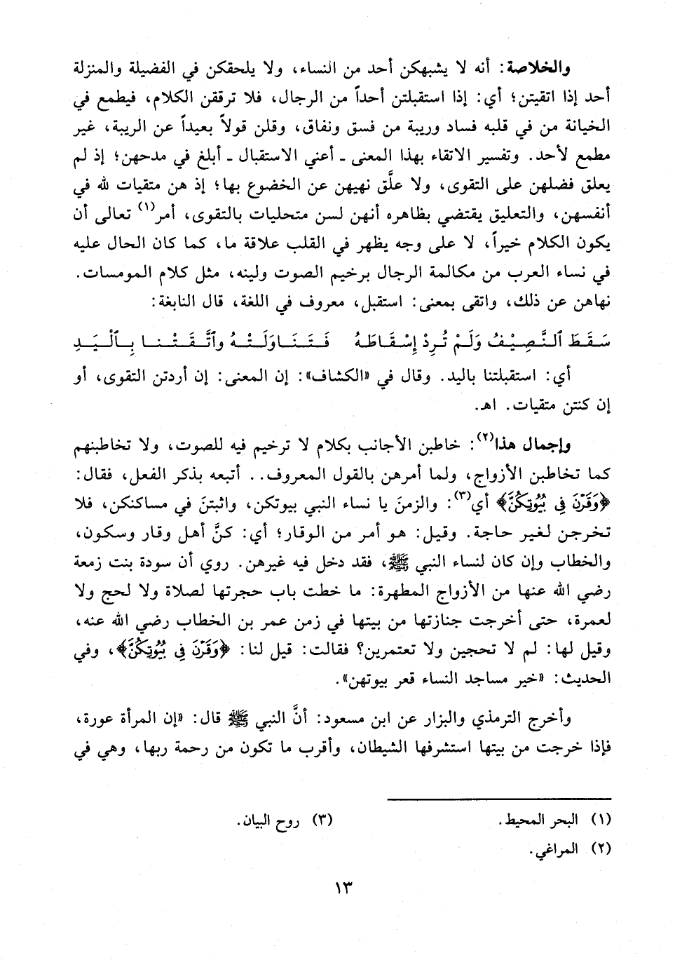 وإجمال هذا (¬2): خاطبن الأجانب بكلام لا ترخيم فيه للصوت، ولا تخاطبنهم كما تخاطبن الأزواج،