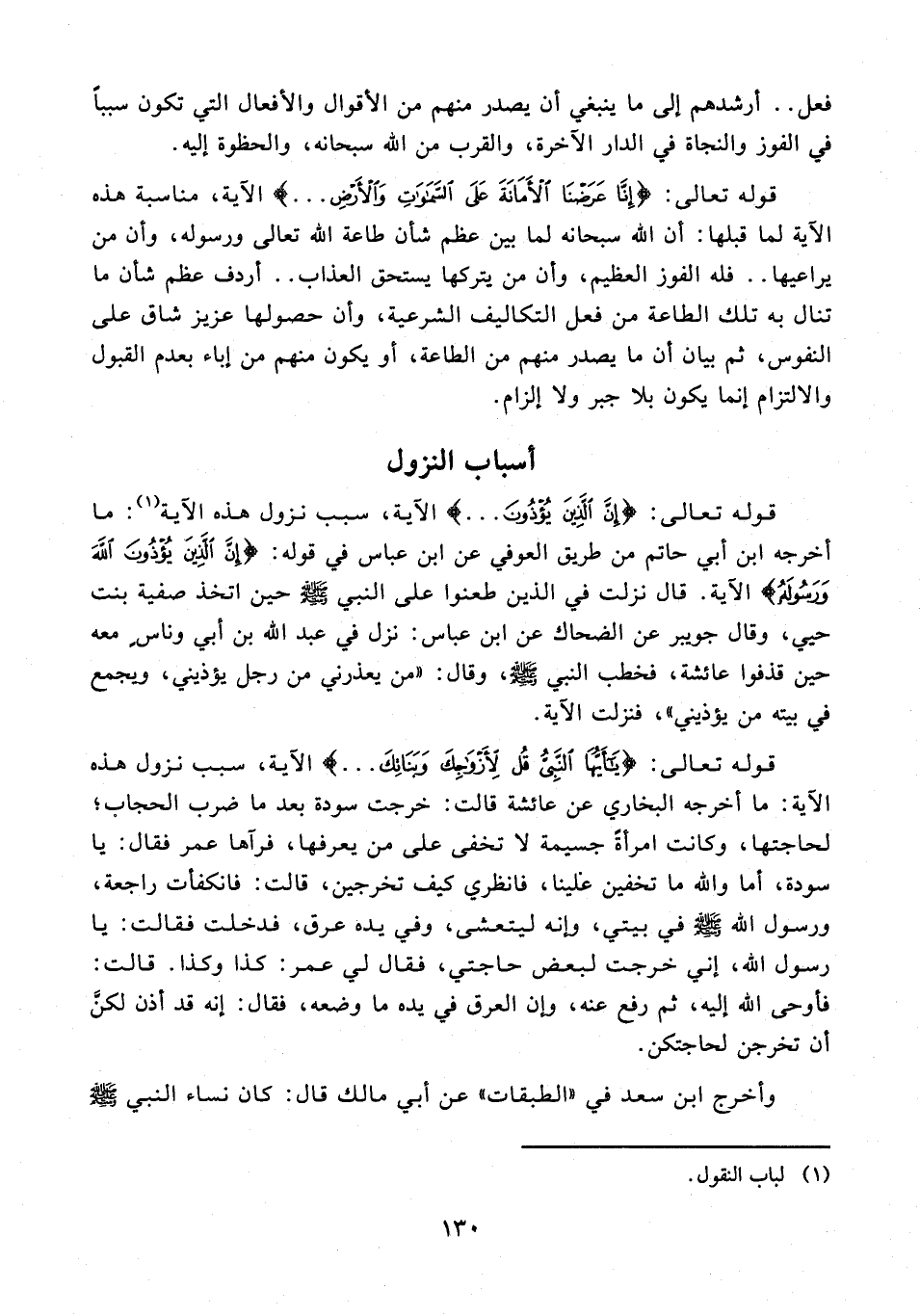 قوله تعالى: {يَا أَيُّهَا النَّبِيُّ قُلْ لِأَزْوَاجِكَ وَبَنَاتِكَ ...} الآية، سبب نزول هذه الآية: ما أخرجه البخاري عن عائشة قالت: خرجت سودة بعدما ضرب الحجاج؛ لحاجتها، وكانت امرأةً جسيمة لا تخفى على من يعرفها، فرآها عمر فقال: يا سودة، أما والله ما تخفين علينا، فانظري كيف تخرجين، قالت: فانكفأت راجعة، ورسول الله - صلى الله عليه وسلم - في بيتي، وإنه ليتعشى، وفي يده عرق، فدخلت فقالت: يا رسول الله، إني خرجت لبعض حاجتي، فقال لي عمر: كذا وكذا. قالت: فأوحى الله إليه، ثم رفع عنه، وإن العرق في يده ما وضعه، فقال: إنه قد أذن لكنَّ أن تخرجن لحاجتكن.