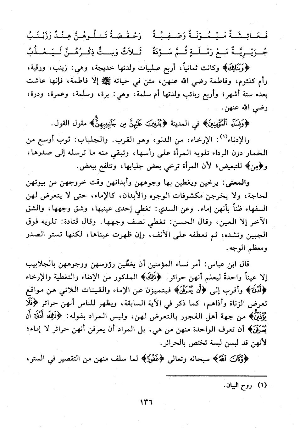 والإدناء (¬1): الإرخاء، من الدنو، وهو القرب. والجلباب: ثوب أوسع من الخمار دون الرداء تلويه المرأة على رأسها، وتبقي منه ما ترسله إلى صدرها، و {مِنْ} للتبعيض؛ لأن المرأة ترخي بعض جلبابها، وتتلفع ببعض.