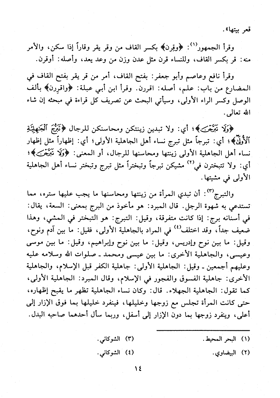 والتبرج (¬3): أن تبدي المرأة من زينتها ومحاسنها ما يجب عليها ستره، مما تستدعي به شهوة الرجل. قال المبرد: هو مأخوذ من البرج بمعنى: السعة، يقال: في أسنانه برج: إذا كانت متفرقة، وقيل: التبرج: هو التبختر في المشي، وهذا ضعيف جدًا، وقد اختلف (¬4) في المراد بالجاهلية الأولى، فقيل: ما بين آدم ونوح، وقيل: ما بين نوح وإدريس، وقيل: ما بين نوح وإبراهيم، وقيل: ما بين موسى وعيسى، والجاهلية الأخرى: ما بين عيسى ومحمد - صلوات الله وسلامه عليه وعليهم أجمعين - وقيل: الجاهلية الأولى: جاهلية الكفر قبل الإِسلام، والجاهلية الأخرى: جاهلية الفسوق والفجور في الإِسلام، وقال المبرد: الجاهلية الأولى، كما تقول: الجاهلية الجهلاء. قال: وكان نساء الجاهلية تظهر ما يقبح إظهاره، حتى كانت المرأة تجلس مع زوجها وخليلها، فينفرد خليلها بما فوق الإزار إلى أعلى، وينفرد زوجها بما دون الإزار إلى أسفل، وربما سأل أحدهما صاحبه البدل.