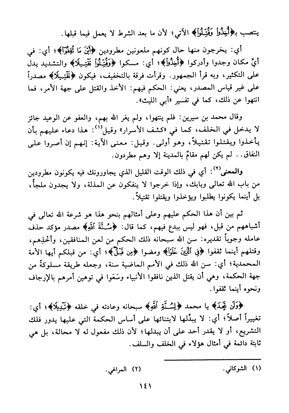 وقال محمد بن سيرين: فلم ينتهوا, ولم يغر الله بهم، والعفو عن الوعيد جائز لا يدخل في الخلف، كما في "كشف الأسرار" وقيل (¬1):هذا دعاء عليهم بأن يأخذوا ويقتلوا تقتيلًا، وهو أولى. وقيل: معنى الآية: إنهم إن أصروا على النفاق .. لم يكن لهم مقامٌ بالمدينة إلا وهم مطردون.
