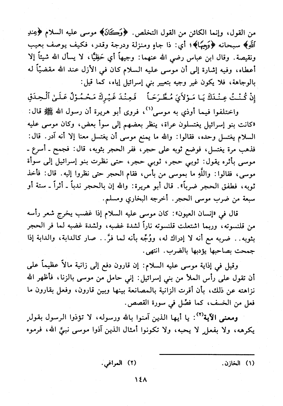 واختلفوا فيما أوذي به موسى (¬1)، فروى أبو هريرة أن رسول الله - صلى الله عليه وسلم - قال: "كانت بنو إسرائيل يغتسلون عراة، ينظر بعضهم إلى سوأ بعض، وكان موسى عليه السلام يغتسل وحده، فقالوا: والله ما يمنع موسى أن يغتسل معنا إلا أنه آدر. قال: فذهب مرة يغتسل، فوضع ثوبه على حجر، ففر الحجر بثوبه، قال: فجمح - أسرع - موسى بأثره يقول: ثوبي حجر، ثوبي حجر، حتى نظرت بنو إسرائيل إلى سوأة موسى، فقالوا: واللهِ ما بموسى من بأس، فقام الحجر حتى نظروا إليه. قال: فأخذ ثوبه، فطفق الحجر ضربًا". قال أبو هريرة: والله إن بالحجر ندبًا - أثرًا - ستة أو سبعة من ضرب موسى الحجر. أخرجه البخاري ومسلم.