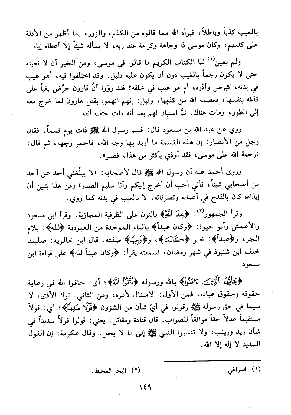 ولم يعين (¬1) لنا الكتاب الكريم ما قالوا في موسى، ومن الخير أن لا نعينه حتى لا يكون رجمًا بالغيب دون أن يكون عليه دليل. وقد اختلفوا فيه، أهو عيب في بدنه، كبرص وأدْره، أم هو عيب في خلقه؟ فقد روَوا أنَّ قارون حرَّض بغيًا على قذفه بنفسها، فعصمه الله من كذبها، وقيل: إنهم اتهموه بقتل هارون لما خرج معه إلى الطور، ومات هناك، ثمَّ استبان لهم بعد أنه مات حتف أنفه.
