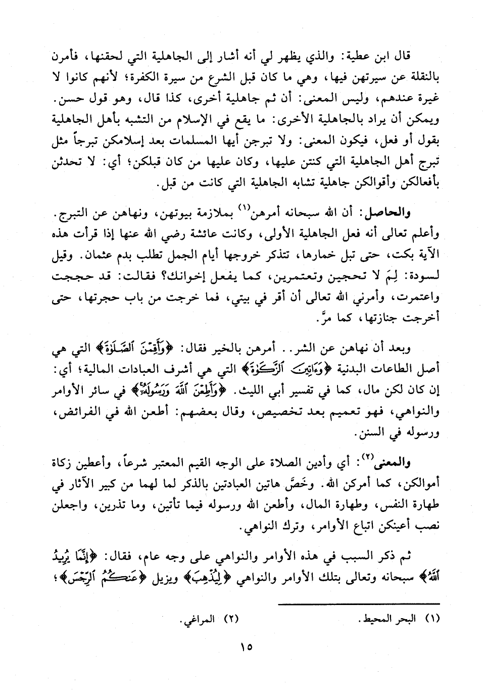 والحاصل: أن الله سبحانه أمرهن (¬1) بملازمة بيوتهن، ونهاهن عن التبرج. وأعلم تعالى أنه فعل الجاهلية الأولى، وكانت عائشة رضي الله عنها إذا قرأت هذه الآية بكت، حتى تبل خمارها، تتذكر خروجها أيام الجمل تطلب بدم عثمان. وقيل لسودة: لِمَ لا تحجين وتعتمرين، كما يفعل إخوانك؟ فقالت: قد حججت واعتمرت، وأمرني الله تعالى أن أقر في بيتي، فما خرجت من باب حجرتها، حتى أخرجت جنازتها، كما مرَّ.
