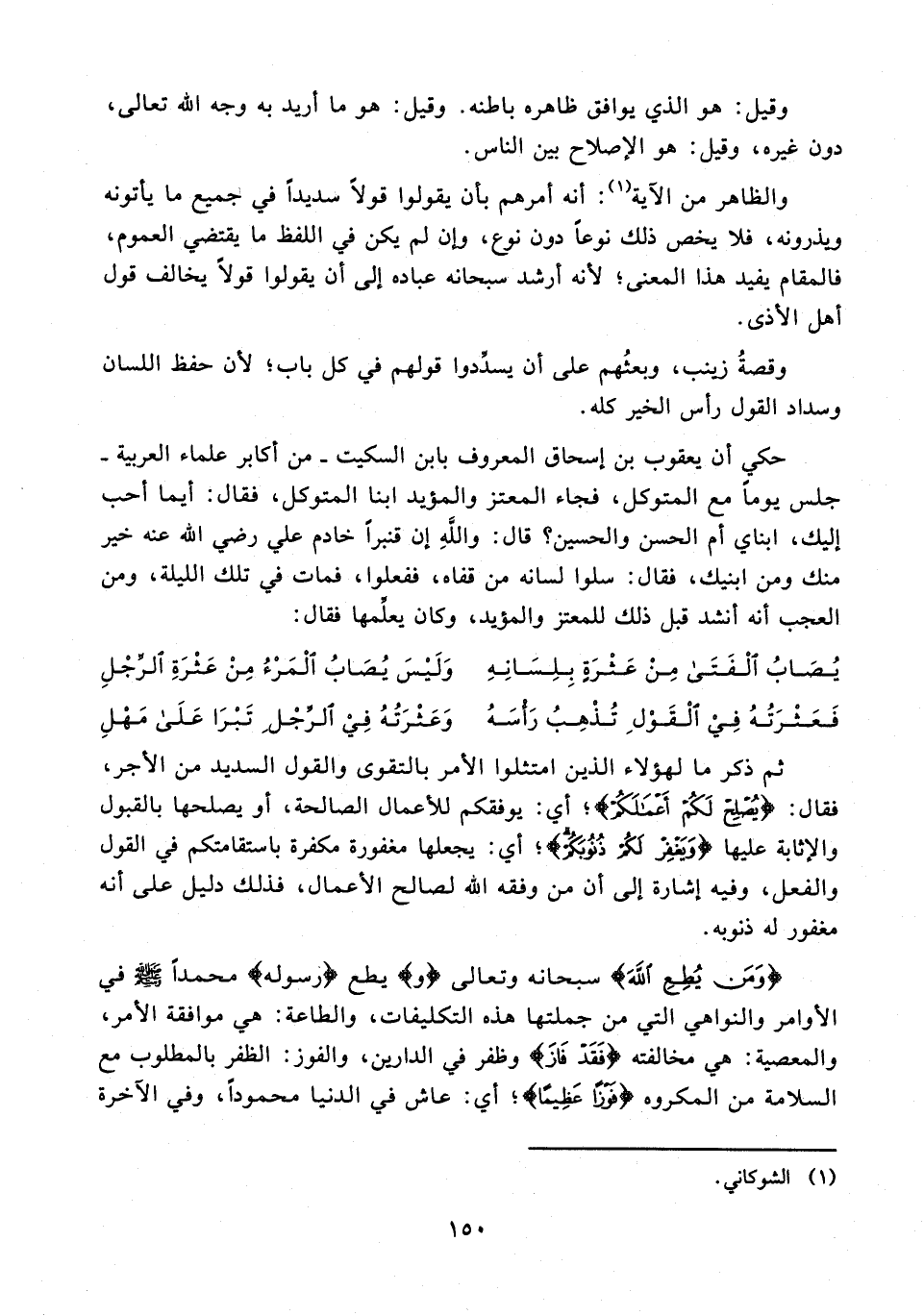 71 - ثم ذكر ما لهؤلاء الذين امتثلوا الأمر بالتقوى والقول السديد من الأجر، فقال: {يُصْلِحْ لَكُمْ أَعْمَالَكُمْ}؛ أي: يوفقكم للأعمال الصالحة، أو يصلحها بالقبول والإثابة عليها {وَيَغْفِرْ لَكُمْ ذُنُوبَكُمْ}؛ أي: يجعلها مغفورة مكفرة باستقامتكم في القول والفعل، وفيه إشارة إلى أن من وفقه الله لصالح الأعمال، فذلك دليل على أنه مغفور له ذنوبه.