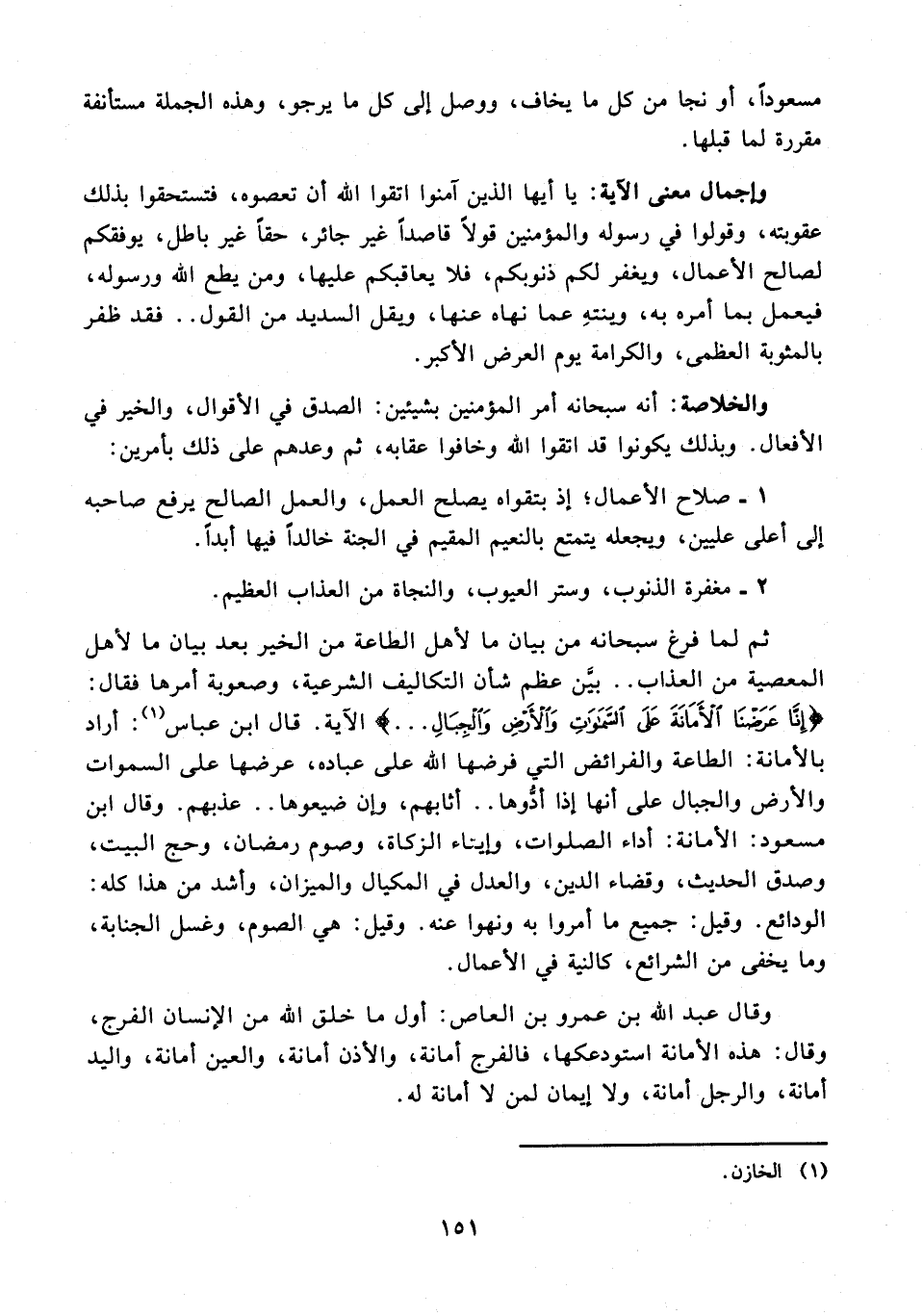 72 - ثم لما فرغ سبحانه من بيان ما لأهل الطاعة من الخير بعد بيان ما لأهل المعصية من العذاب .. بين عظم شأن التكاليف الشرعية، وصعوبة أمرها فقال: {إِنَّا عَرَضْنَا الْأَمَانَةَ عَلَى السَّمَاوَاتِ وَالْأَرْضِ وَالْجِبَالِ ...} الآية. قال ابن عباس (¬1): أراد بالأمانة: الطاعة والفرائض التي فرضها الله على عباده، عرضها على السموات والأرض والجبال على أنها إذا أدُّوها .. أثابهم، وإن ضيعوها .. عذبهم. وقال ابن مسعود: الأمانة: أداء الصلوات، وايتاء الزكاة، وصوم رمضان، وحج البيت، وصدق الحديث، وقضاء الدين، والعدل في المكيال والميزان, وأشد من هذا كله: الودائع. وقيل: جميع ما أمروا به ونهوا عنه. وقيل: هي الصوم، وغسل الجنابة، وما يخفى من الشرائع، كالنية في الأعمال.