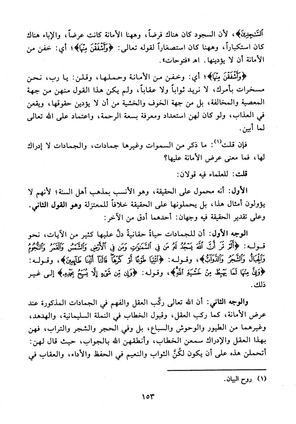 والوجه الثاني: أن الله تعالى ركَّب العقل والفهم في الجمادات المذكورة عند عرض الأمانة، كما ركب العقل، وقبول الخطاب في النملة السليمانية، والهدهد، وغيرهما من الطيور والوحوش والسباع، بل وفي الحجر والشجر والتراب، فهن بهذا العقل والإدراك سمعن الخطاب، وأنطقهن الله بالجواب، حيث قال لهن: أتحملن هذه على أن يكون لكُنَّ الثواب والنعيم في الحفظ والأداء، والعقاب في