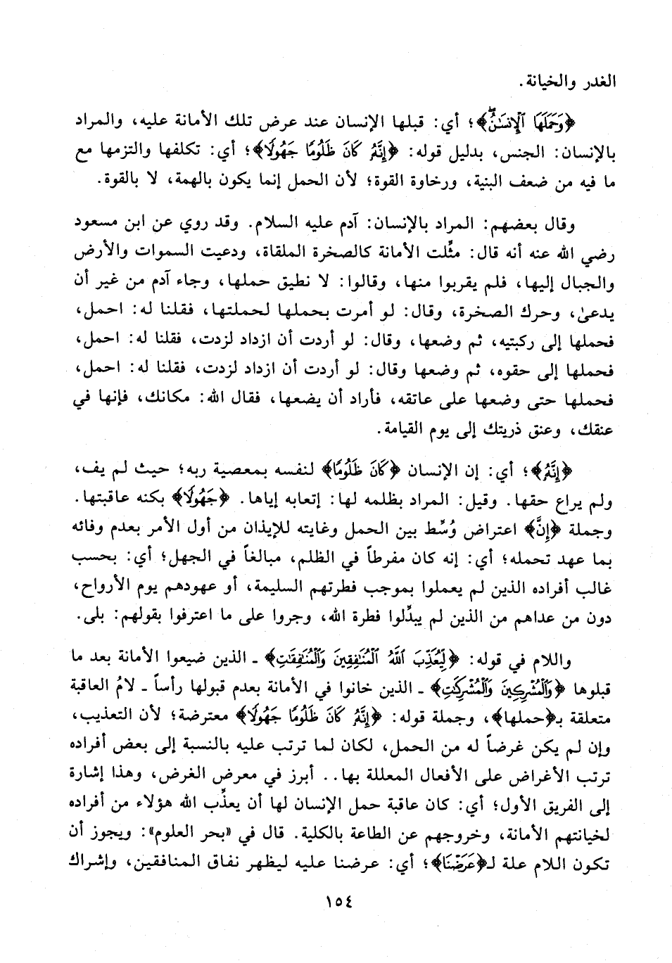 وقال بعضهم: المراد بالإنسان: آدم عليه السلام. وقد روي عن ابن مسعود رضي الله عنه أنه قال: مثلت الأمانة كالصخرة الملقاة، ودعيت السموات والأرض والجبال إليها، فلم يقربوا منها، وقالوا: لا نطيق حملها، وجاء آدم من غير أن يدعى، وحرك الصخرة، وقال: لو أمرت بحملها لحملتها، فقلنا له: احمل، فحملها إلى ركبتيه، ثم وضعها، وقال: لو أردت أن ازداد لزدت، فقلنا له: احمل، فحملها إلى حقوه، ثم وضعها وقال: لو أردت أن ازداد لزدت، فقلنا له: احمل، فحملها حتى وضعها على عاتقه، فأراد أن يضعها، فقال الله: مكانك، فإنها في عنقك، وعنق ذريتك إلى يوم القيامة.