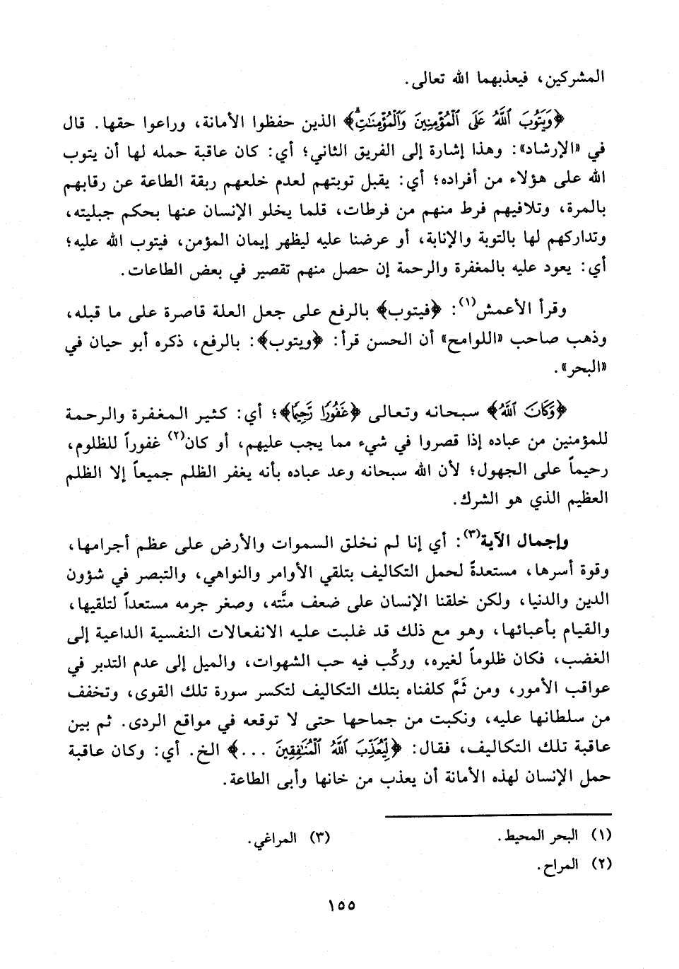 وإجمال الآية (¬3): أي إنا لم نخلق السموات والأرض على عظم أجرامها، وقوة أسرها، مستعدةً لحمل التكاليف بتلقي الأوامر والنواهي، والتبصر في شؤون الدين والدنيا, ولكن خلقنا الإنسان على ضعف منَّته، وصغر جرمه مستعدًا لتلقيها، والقيام بأعبائها، وهو مع ذلك قد غلبت عليه الانفعالات النفسية الداعية إلى الغضب، فكان ظلومًا لغيره، وركِّب فيه حب الشهوات، والميل إلى عدم التدبر في عواقب الأمور، ومن ثَمَّ كلفناه بتلك التكاليف لتكسر سورة تلك القوى، وتخفف من سلطانها عليه، ونكبت من جماحها حتى لا توقعه في مواقع الردى. ثم بين عاقبة تلك التكاليف، فقال: {لِيُعَذِّبَ اللَّهُ الْمُنَافِقِينَ ...} الخ. أي: وكان عاقبة حمل الإنسان لهذه الأمانة أن يعذب من خانها وأبى الطاعة.