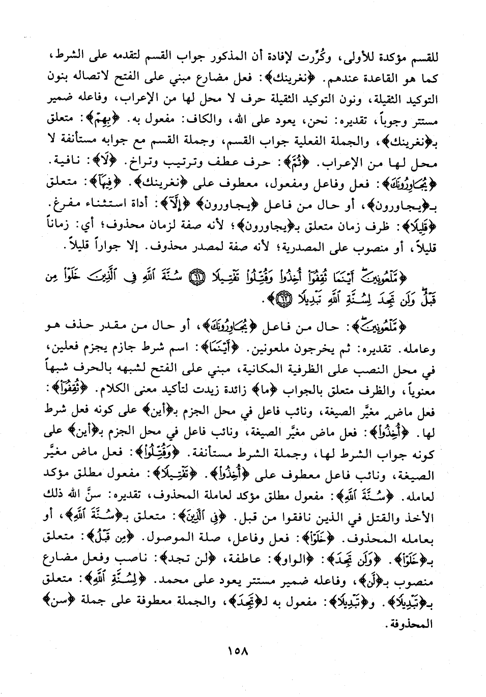 {مَلْعُونِينَ}: حال من فاعل {يُجَاوِرُونَكَ}، أو حال من مقدر حذف هو وعامله. تقديره: ثم يخرجون ملعونين. {أَيْنَمَا}: اسم شرط جازم يجزم فعلين، في محل النصب على الظرفية المكانية، مبني على الفتح لشبهه بالحرف شبهًا معنويًا، والظرف متعلق بالجواب {ما} زائدة زيدت لتأكيد معنى الكلام. {ثُقِفُوا}: فعل ماضٍ مغيَّر الصيغة، ونائب فاعل في محل الجزم بـ {أَيْن} على كونه فعل شرط لها. {أُخِذُوا}: فعل ماض مغيَّر الصيغة، ونائب فاعل في محل الجزم بـ {أَيْن} على كونه جواب الشرط لها، وجملة الشرط مستأنفة. {وَقُتِّلُوا}: فعل ماض مغيَّر الصيغة، ونائب فاعل معطوف على {أُخِذُوا}. {تَقْتِيلًا}: مفعول مطلق مؤكد لعامله. {سُنَّةَ اللَّهِ}: مفعول مطلق مؤكد لعاملة المحذوف، تقديره: سنَّ الله ذلك الأخذ والقتل في الذين نافقوا من قبل. {فِي الَّذِينَ}: متعلق بـ {سُنَّةَ اللَّهِ}، أو بعامله المحذوف. {خَلَوْا}: فعل وفاعل، صلة الموصول. {مِنْ قَبْلُ}: متعلق بـ {خَلَوْا}. {وَلَنْ تَجِدَ}: {الواو}: عاطفة، {لَن تجد}: ناصب وفعل مضارع منصوب بـ {وَلَنْ تَجِدَ}، وفاعله ضمير مستتر يعود على محمد. {لِسُنَّةِ اللَّهِ}: متعلق بـ {تَبْدِيلًا}. و {تَبْدِيلًا}: مفعول به لـ {تَجدَ}، والجملة معطوفة على جملة {سن} المحذوفة.