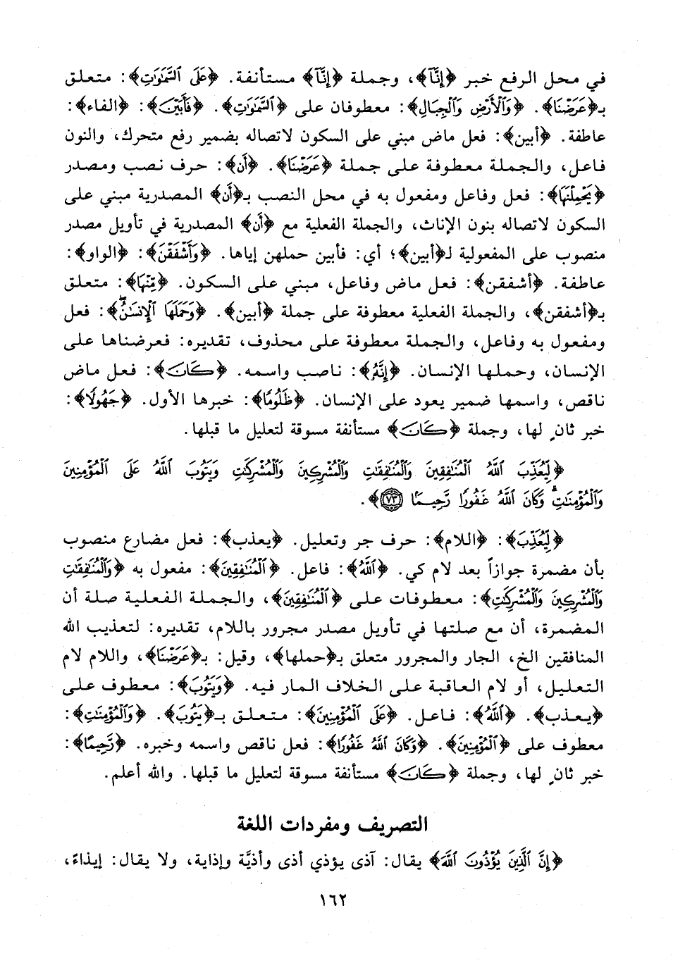 {لِيُعَذِّبَ}: {اللام}: حرف جر وتعليل. {يُعَذِّبَ}: فعل مضارع منصوب بأن مضمرة جوازًا بعد لام كي. {اللَّهُ}: فاعل. {الْمُنَافِقِينَ}: مفعول به {وَالْمُنَافِقَاتِ وَالْمُشْرِكِينَ وَالْمُشْرِكَاتِ}: معطوفات على {الْمُنَافِقِينَ}، والجملة الفعلية صلة أن المضمرة، أن مع صلتها في تأويل مصدر مجرور باللام، تقديره: لتعذيب الله المنافقين الخ، الجار والمجرور متعلق بـ {حَمَلَهَا}، وقيل: بـ {عَرَضْنَا}، واللام لام التعليل، أو لام العاقبة على الخلاف المار فيه. {وَيَتُوبَ}: معطوف على {يُعَذِّبَ}. {اللَّهُ}: فاعل. {عَلَى الْمُؤْمِنِينَ}: متعلق بـ {يَتُوبَ}. {وَالْمُؤْمِنَاتِ}: معطوف على {الْمُؤْمِنِينَ}. {وَكَانَ اللَّهُ غَفُورًا}: فعل ناقص واسمه وخبره. {رَحِيمًا}: خبر ثانٍ لها، وجملة {كَانَ} مستأنفة مسوقة لتعليل ما قبلها. والله أعلم.